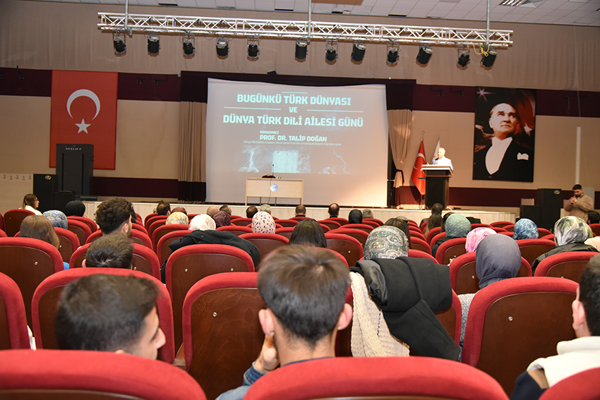 Karamanoğlu Mehmetbey Üniversitesi (KMÜ) ev sahipliğinde Türkçe Öğretmenliği Bölümü, Türk Dili ve Edebiyatı Bölümü, Türkçe Öğretimi Uygulama ve Araştırma Merkezi ile Türk Dili Uygulama ve Araştırma Merkezi iş birliğinde “Bugünkü Türk Dünyası ve Dünya Türk Dili Ailesi Günü” başlıklı konferans gerçekleştirildi. Şehit Ömer Halisdemir Konferans Salonu’nda düzenlenen programa, Rektör Yardımcısı Prof. Dr. İdris Nebi Uysal, Edebiyat Fakültesi Dekanı Prof. Dr. Mehmet Mercan, Eğitim Fakültesi Dekanı Cihat Abdioğlu, akademisyenler ve çok sayıda öğrenci katıldı.