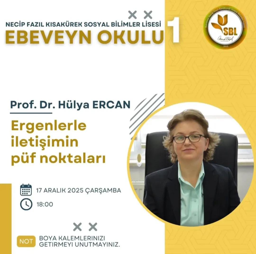 Eğitim Bilimleri Bölümü Rehberlik ve Psikolojik Danışmanlık Ana Bilim Dalı öğretim üyesi Prof. Dr. Hülya ERCAN tarafından 17.12.2025 tarihinde Necip Fazıl Kısakürek Sosyal Bilimler Lisesi velilerine yönelik "Ergenlerle İletişimin Püf Noktaları" konulu bir seminer gerçekleştirilmiştir.