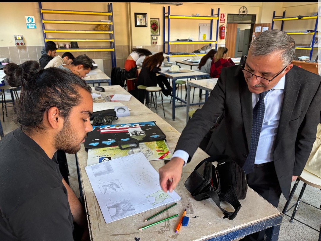 Sayın Rektörümüz; Tezhip Tasarımına Giriş dersinde Öğr. Gör. Ceyda GÜLSEVER, Duvar Süsleme Teknikleri I dersinde Doç. Seda DİLAY ve Cam Süsleme Teknikleri dersinde Dr. Öğr. Üyesi Ali Tekin hocalarımızın derslerini ziyaret ederek öğrencilerle birlikte derse eşlik etmiştir. Öğrencilerimizin her biriyle tek tek ilgilenen, keyifli sohbetler gerçekleştiren, onların görüş ve taleplerini dinleyen Rektörümüz; eğitim süreçlerine dair değerlendirmelerde bulunarak başarı dileklerini iletmiştir.