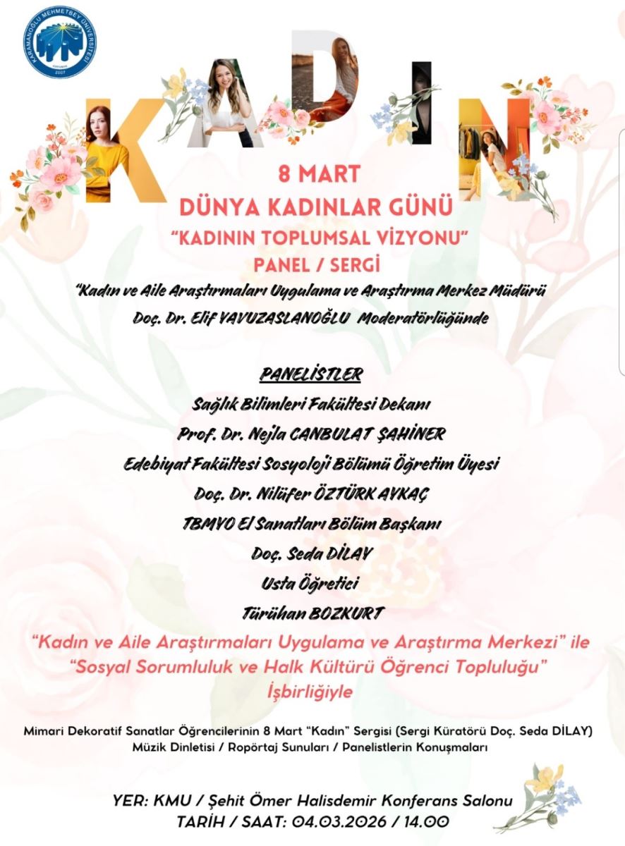 Mimari Dekoratif Sanatlar Programı öğrencilerinden oluşan Doç. Seda DİLAY danışmanlığındaki "Sosyal Sorumluluk ve Halk Kültürü Öğrenci Topluluğu", Doç. Dr. Elif YAVUZASLANOĞLU 'nun müdürlüğünü yürüttüğü "Kadın ve Aile Araştırmaları "Uygulama ve Araştırma Merkezi" işbirliğiyle 8 Mart Dünya Kadınlar Günü kapsamında düzenlenleyeceklerdir. "Kadının Toplumsal Vizyonu" isimli panele katılımlarınınz bizleri onurlandıracaktır.