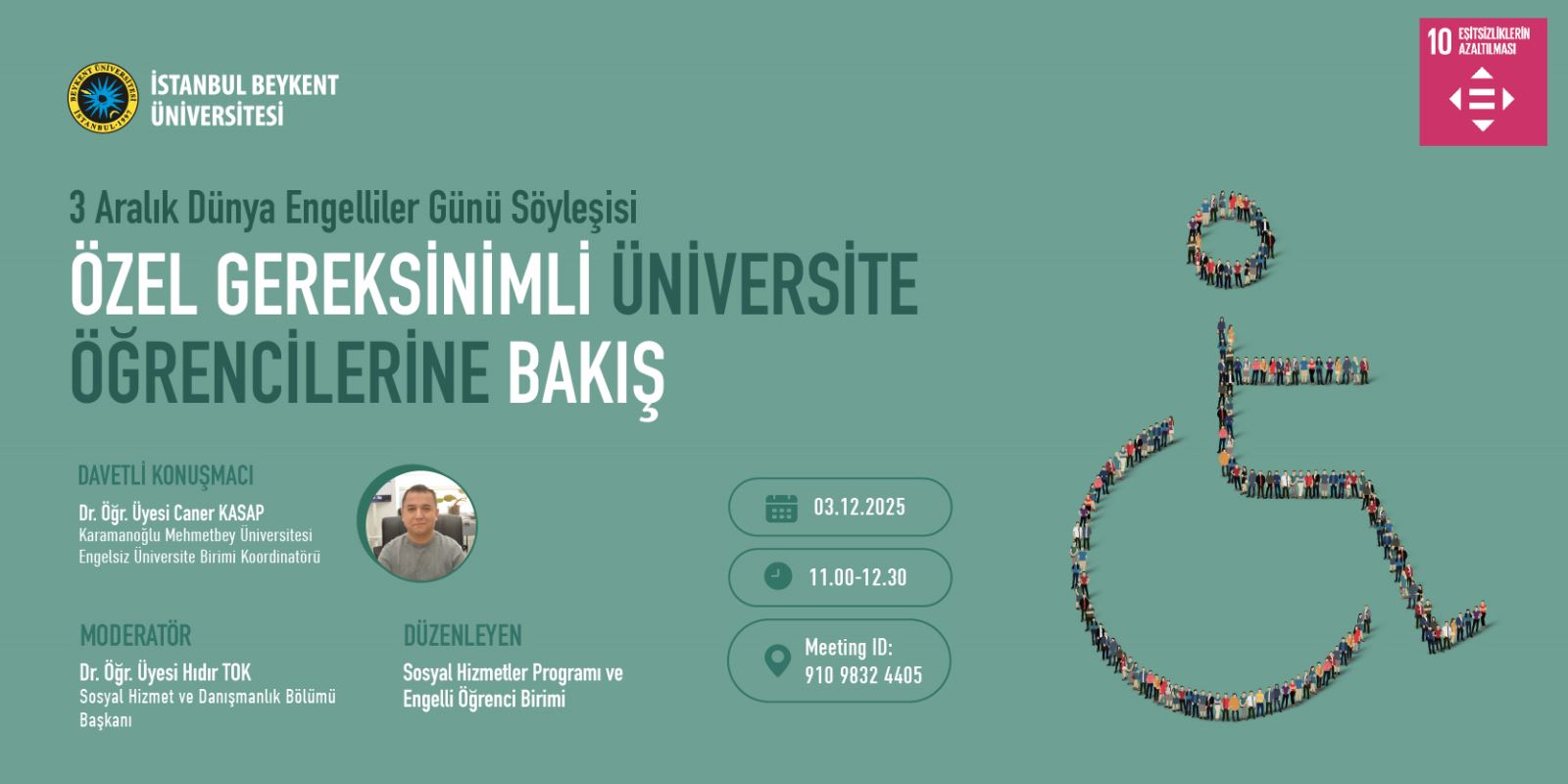 3 Aralık Dünya Engelliler Günü kapsamında İstanbul Beykent Üniversitesi - Sosyal Hizmetler Programı ve Engelli Öğrenci Birimi tarafından düzenlenen "Özel Gereksinimli Üniversite Öğrencilerine Bakış" başlıklı söyleşiye Engelsiz Üniversite Birimi koordinatörü ve Özel Eğitim Bölümü öğretim üyesi Dr. Öğr. Üyesi Caner Kasap konuşmacı olarak katılacaktır.