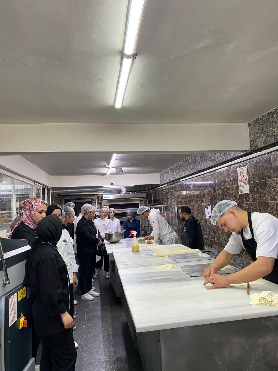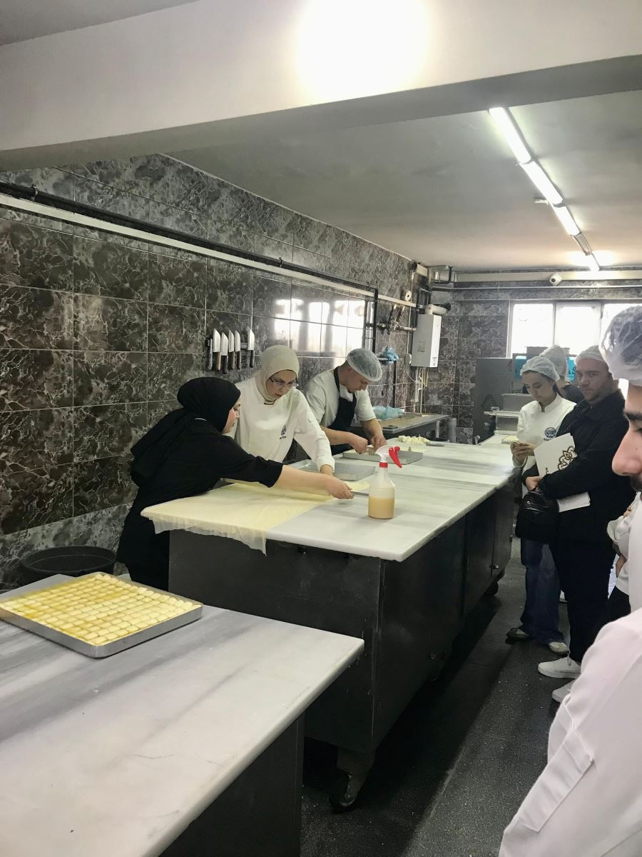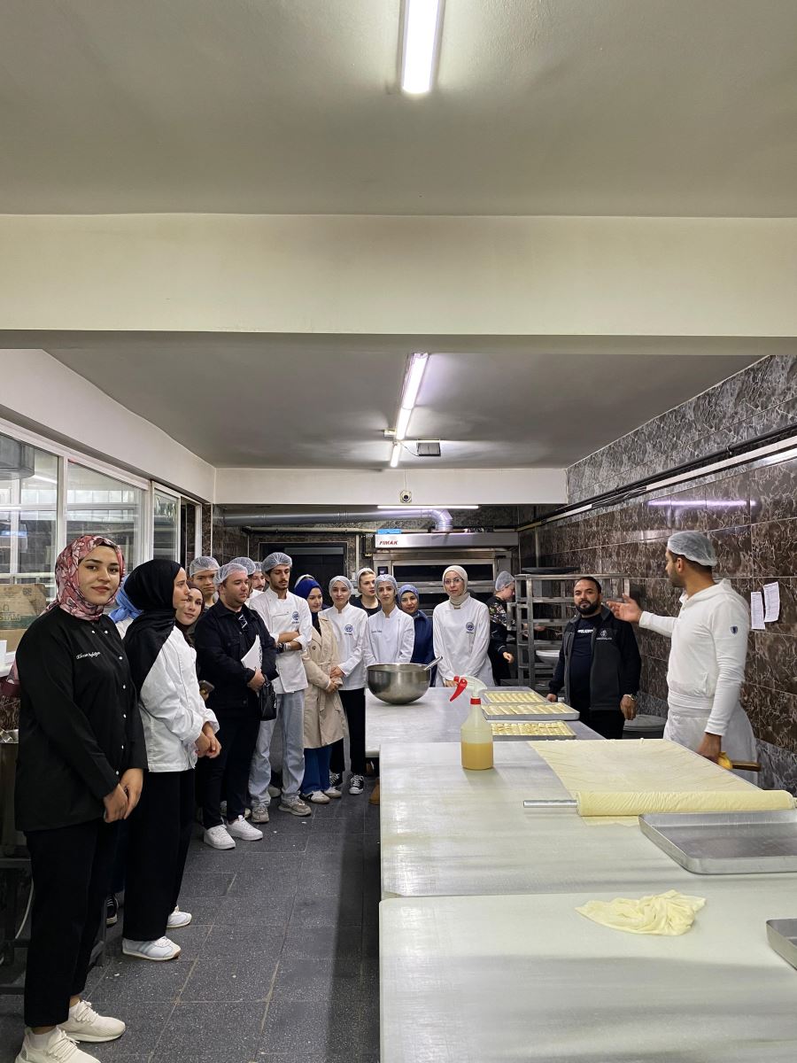 Gastronomi ve Mutfak Sanatları 3. sınıf öğrencileri, Temel Pastacılık ve Ekmekçilik dersi kapsamında Işıkoğulları Pastanesine kapsamlı bir teknik gezi gerçekleştirdi. Öğrenciler, pastanenin üretim alanlarında baklava ve yaş pasta yapım süreçlerini tüm detaylarıyla inceleme fırsatı buldu. Hamur hazırlama, açma teknikleri, şerbet dengesi, katlama yöntemleri, krema üretimi ve süsleme aşamaları gibi profesyonel uygulamalar yerinde gözlemlendi.