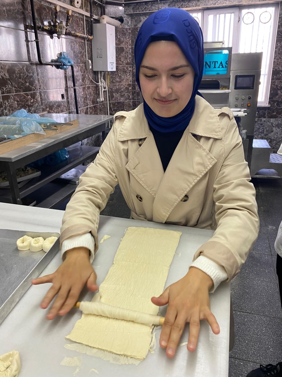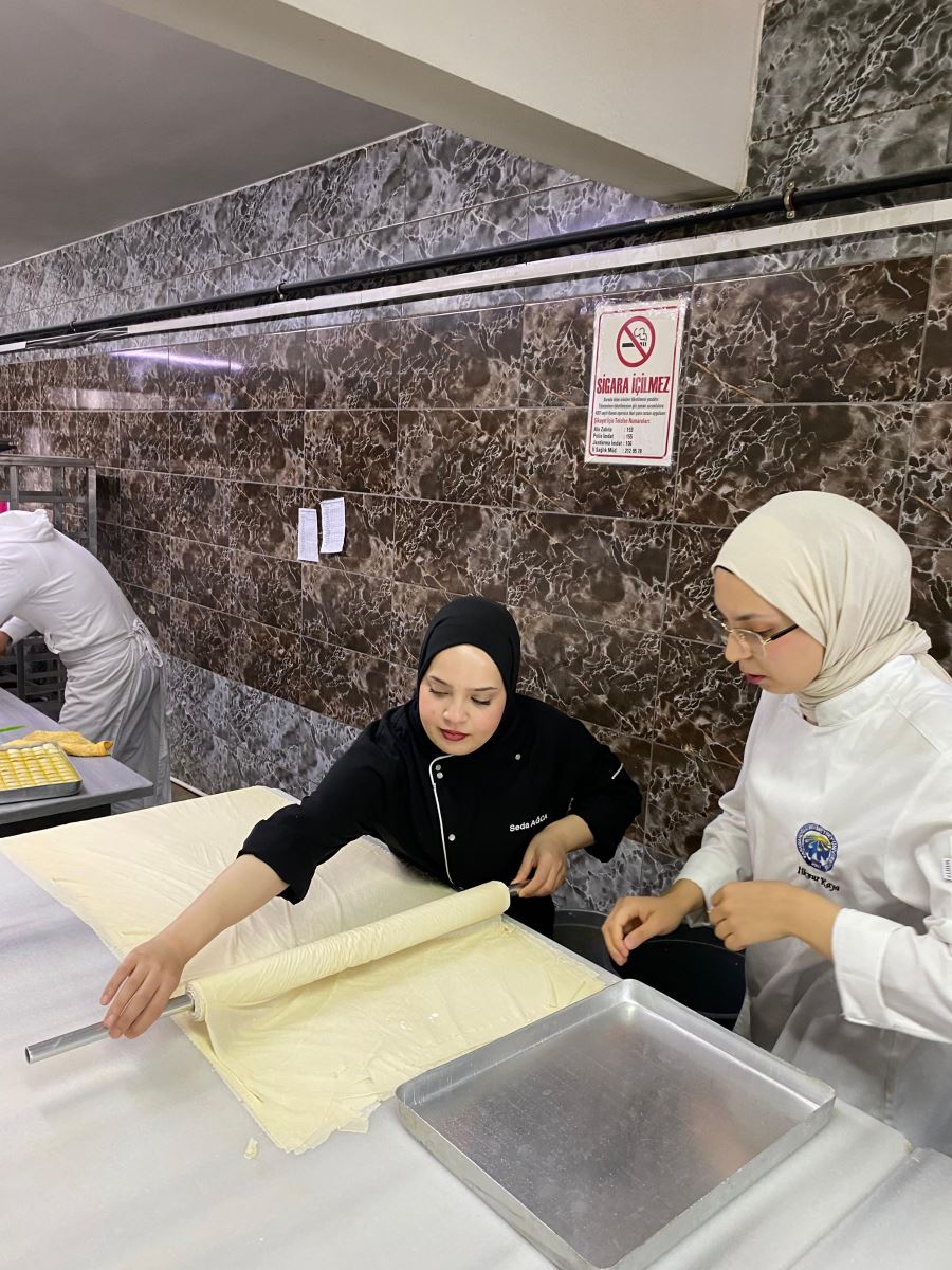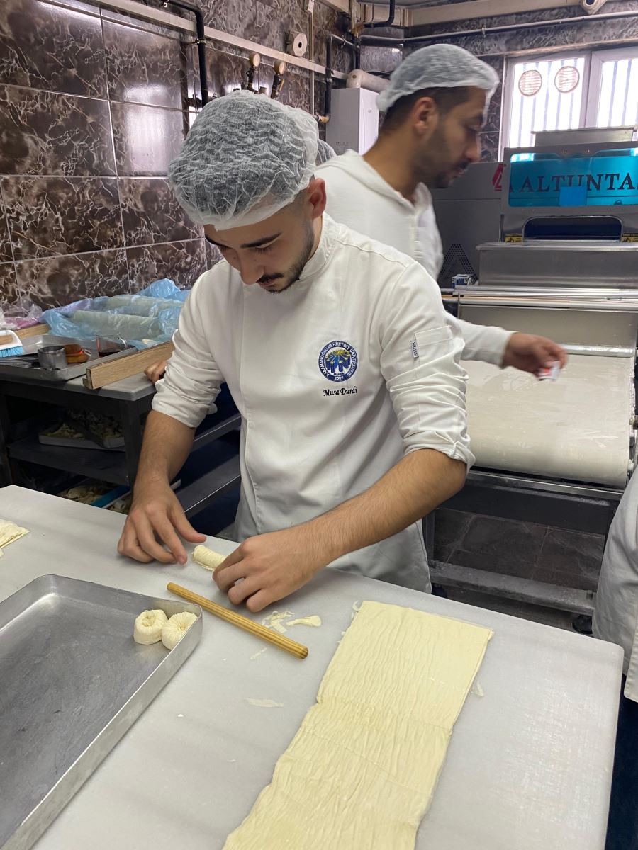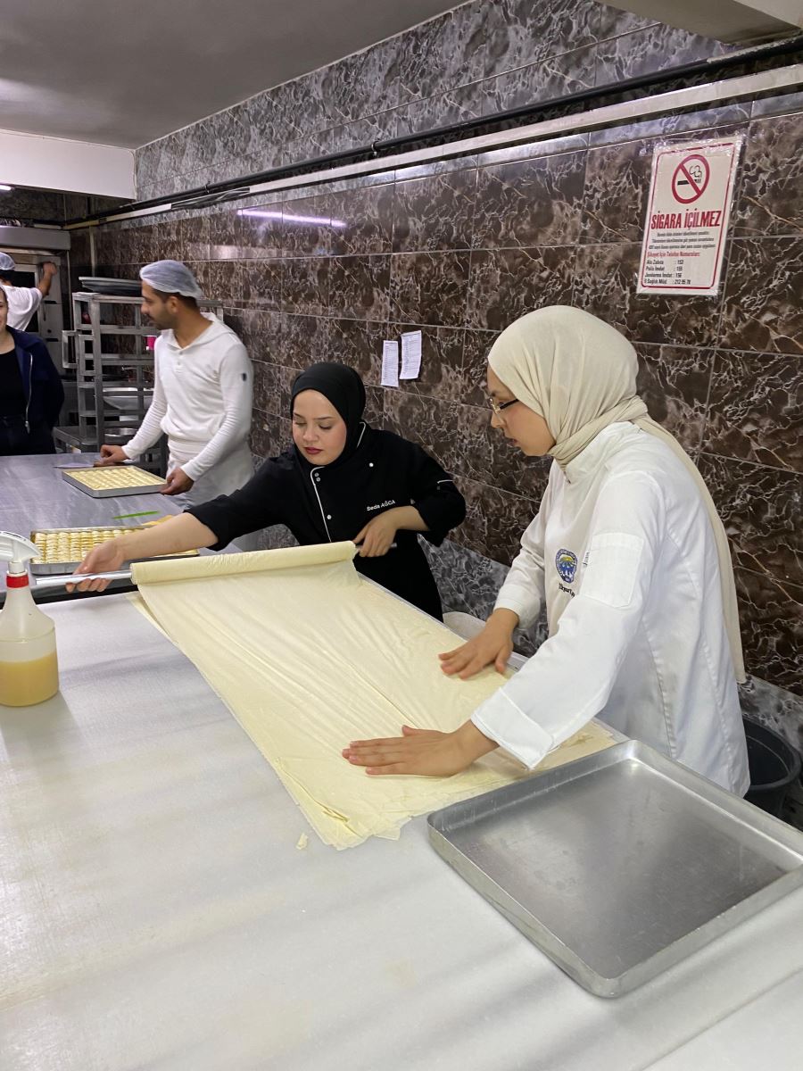 Gastronomi ve Mutfak Sanatları 3. sınıf öğrencileri, Temel Pastacılık ve Ekmekçilik dersi kapsamında Işıkoğulları Pastanesine kapsamlı bir teknik gezi gerçekleştirdi. Öğrenciler, pastanenin üretim alanlarında baklava ve yaş pasta yapım süreçlerini tüm detaylarıyla inceleme fırsatı buldu. Hamur hazırlama, açma teknikleri, şerbet dengesi, katlama yöntemleri, krema üretimi ve süsleme aşamaları gibi profesyonel uygulamalar yerinde gözlemlendi.