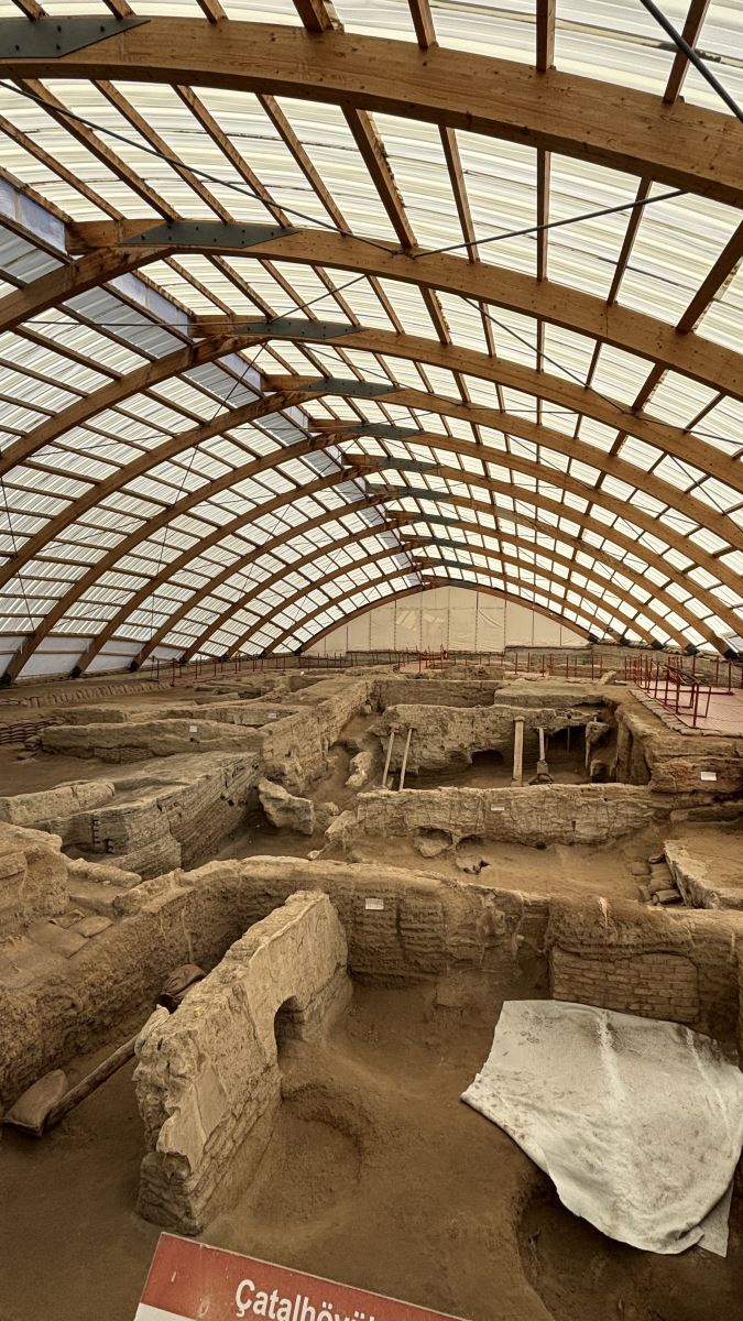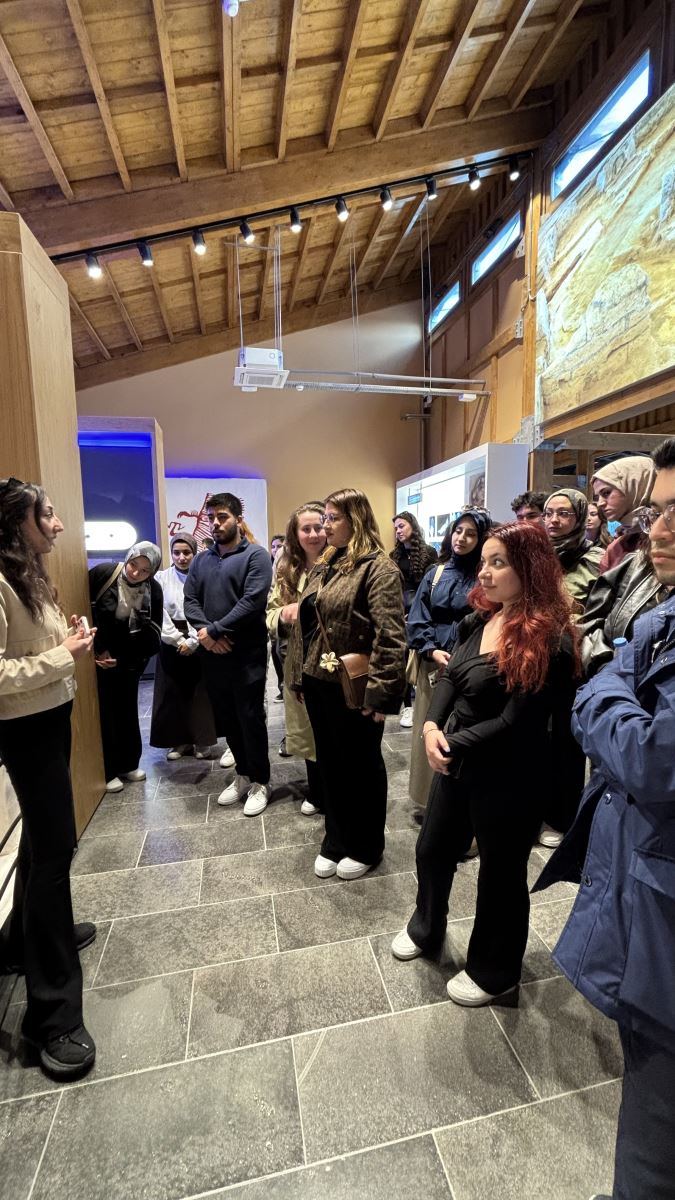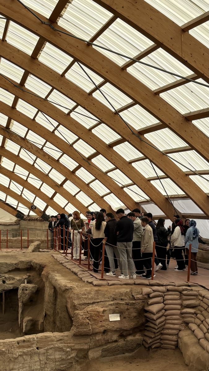 Gastronomi ve Mutfak Sanatları bölümü öğrencileriyle Konya’da yer alan Çatalhöyük’e düzenlenen kültürel gezi kapsamında, öğrenciler insanlık tarihinin en eski yerleşim alanlarından birinde geçmiş yaşam biçimlerini, kültürel yapıyı ve ilk mutfak pratiklerini yerinde inceleme fırsatı buldu; Neolitik döneme uzanan bu önemli arkeolojik alanda gerçekleştirilen incelemelerde, yerleşik hayata geçiş süreci, beslenme alışkanlıklarının dönüşümü, üretim ve tüketim ilişkileri ile yemek kültürünün tarihsel temelleri üzerine kapsamlı değerlendirmeler yapıldı, öğrenciler hem teorik bilgilerini sahada pekiştirdi hem de gastronominin yalnızca bir mutfak pratiği değil aynı zamanda kültürel bir miras ve yaşam biçimi olduğunu somut örnekler üzerinden deneyimledi, gerçekleştirilen bu etkinlik öğrencilerin disiplinlerarası bakış açısını geliştirmesine katkı sağlayarak mesleki farkındalıklarını ve kültürel duyarlılıklarını artırdı.