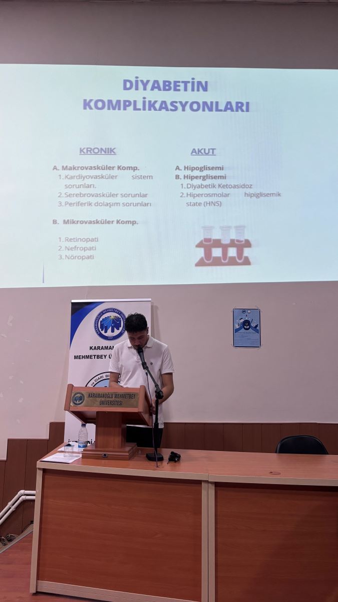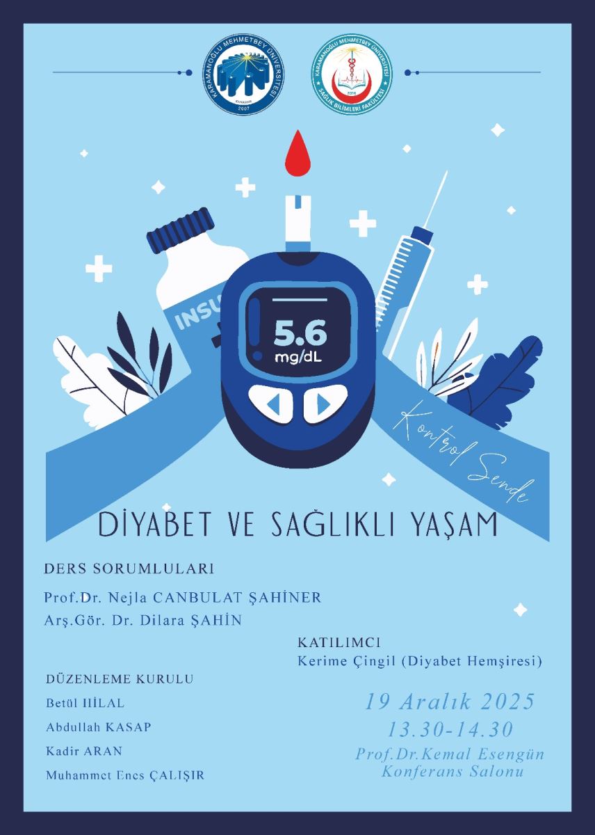 Bölümümüz tarafından “Diyabet ve Sağlıklı Yaşam” başlıklı bir etkinlik gerçekleştirildi. Prof. Dr. Kemal Esengün Konferans Salonu’nda düzenlenen program, 19 Aralık 2025 tarihinde 13.30–14.30 saatleri arasında yapıldı.