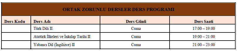 Ortak zorunlu derslere ilişkin ders programı aşağıdaki tabloda belirtilmiştir.