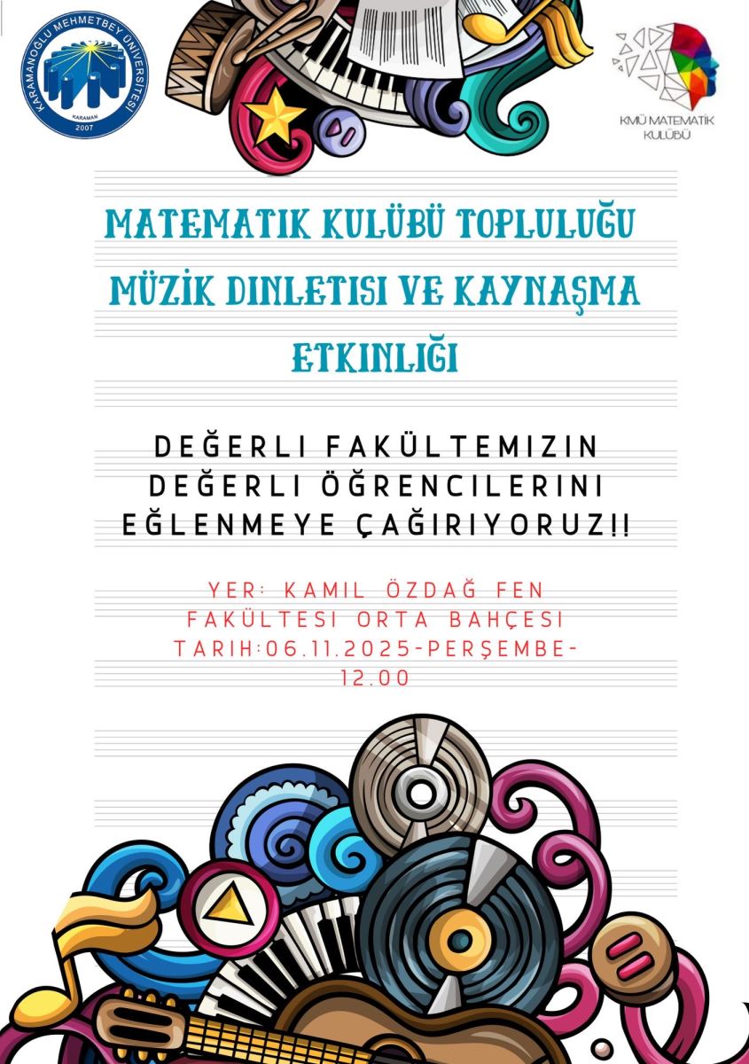 6 Kasım 2025 tarihinde Matematik Kulübü Topluluğu tarafından organize edilen "Müzik Dinletisi ve Kaynaşma Etkinliği" yapılacaktır.