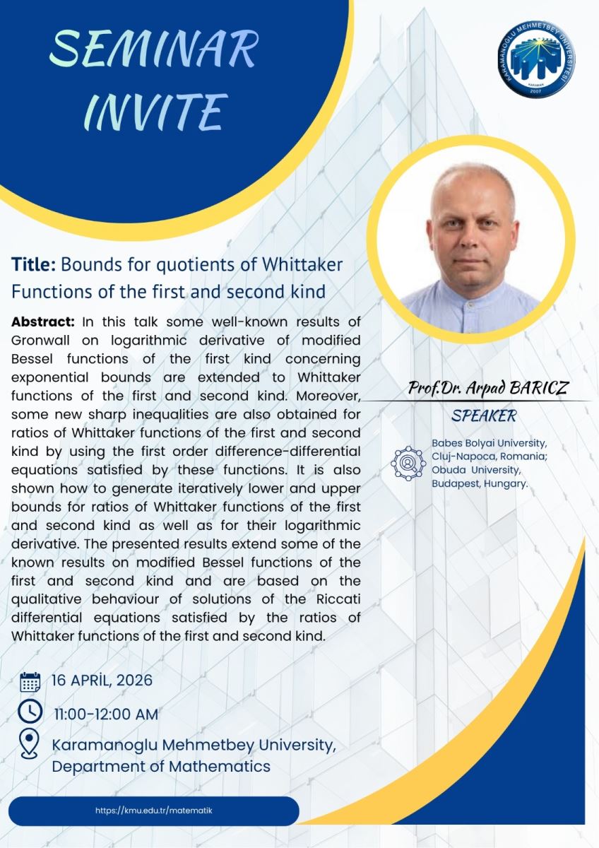 Prof.Dr. İbrahim Aktaş'ın özel daveti üzerine bölümümüzü ziyaret edecek olan Prof. Dr. Arpad Baricz, 16 Nisan 2026, saat 11:00-12:00 arasında Matematik Seminer Salonunda "Bounds for quotients of Whittaker functions of the first and second kind" başlıklı bir sunum gerçekleştirecektir.