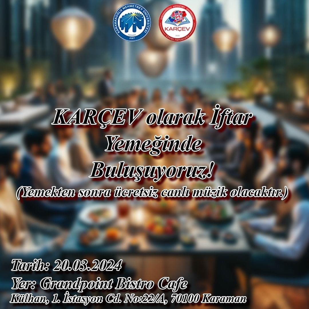 KARÇEV öğrenci topluluğu tarafından düzenlenen iftar yemeği organizasyonu 20.03.2024 tarihinde Grandpoint Bistro Cafe'de gerçekleştirilmiştir.