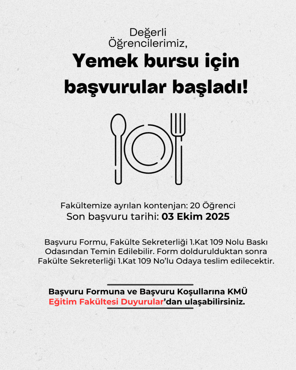 https://kmu.edu.tr/egitim/duyuru/46437/yemek-bursuna-basvuruda-bulanacak-ogrencilerimizin-dikkatine!/tr linkinden başvuru koşullarına ve formuna ulaşabilirsiniz.