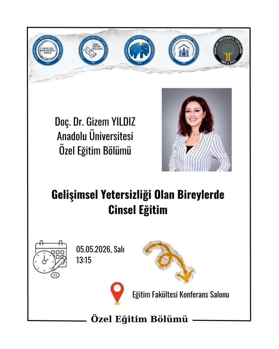 Anadolu Üniversitesi Özel Eğitim Bölümü'nden Doç. Dr. Gizem YILDIZ, "Gelişimsel Yetersizliği Olan Bireylerde Cinsel Eğitim" hakkında 05.05.2026 Salı günü saat 13.15'te Eğitim Fakültesi Konferans Salonunda eğitim verecektir. Tüm öğrencilerimizi bekleriz.