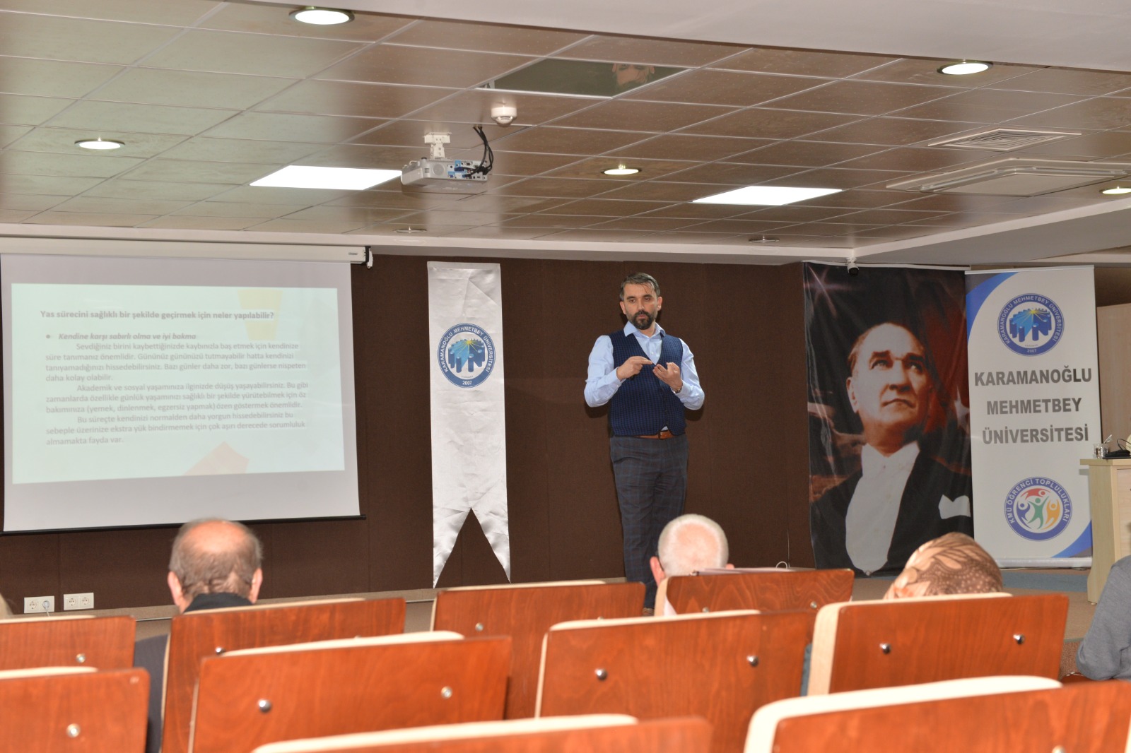 Karamanoğlu Mehmetbey Üniversitesi Sağlık Bilimleri Fakültesi tarafından bir sosyal sorumluluk projesi olarak düzenlenen “60+ Yaşam Boyu Öğrenme Akademisi” kapsamında katılımcılara Psikolojik Danışma ve Rehberlik Uygulama ve Araştırma Merkezi Müdürümüz Doç. Dr. Nezir EKİNCİ tarafından 16.04. 2026 tarihinde “Kayıp ve Yas Danışmanlığı” ile ilgili eğitim verildi.
