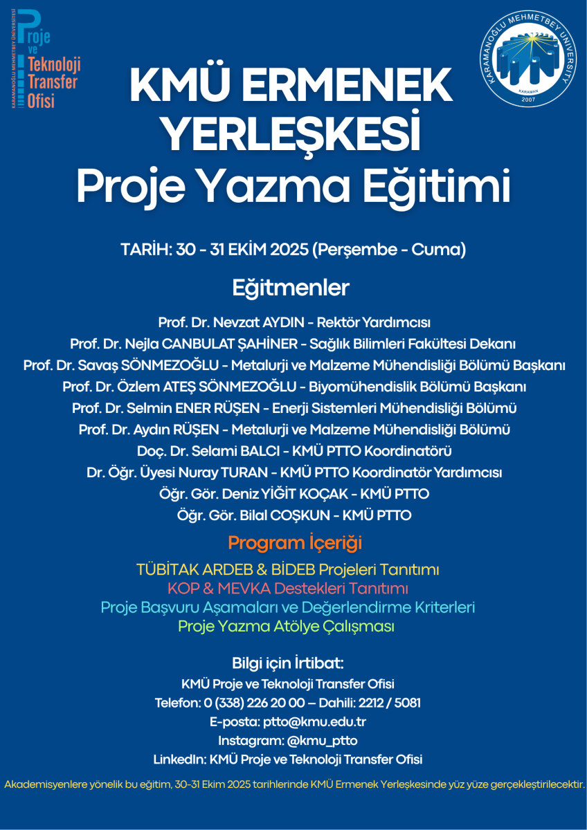 Karamanoğlu Mehmetbey Üniversitesi KMÜ Proje ve Teknoloji Transfer Ofisi tarafından, 30–31 Ekim 2025 (Perşembe–Cuma) tarihlerinde KMÜ Ermenek Yerleşkesi’nde akademisyen ve öğrencilere yönelik Proje Yazma Eğitimi gerçekleştirilecektir.