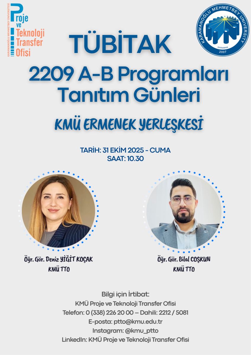 Karamanoğlu Mehmetbey Üniversitesi KMÜ Proje ve Teknoloji Transfer Ofisi tarafından, 31 Ekim 2025 Cuma günü Ermenek Yerleşkesi’nde TÜBİTAK 2209-A Üniversite Öğrencileri Araştırma Projeleri ve 2209-B Sanayiye Yönelik Araştırma Projeleri Destekleme Programları tanıtım etkinliği düzenlenecektir.