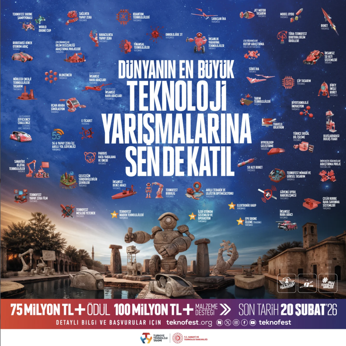 Dünyanın en büyük havacılık, uzay ve teknoloji festivali #TEKNOFEST, 2026 yılında kapılarını yeniden açıyor. 52 ana kategori ve 127 alt kategoriden oluşan teknoloji yarışmaları için başvuru süreci resmen başlamıştır.