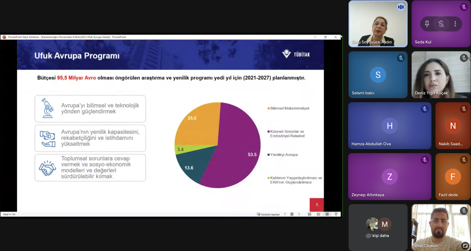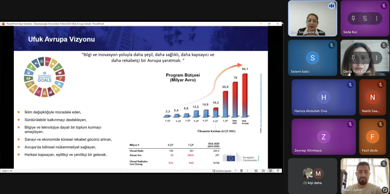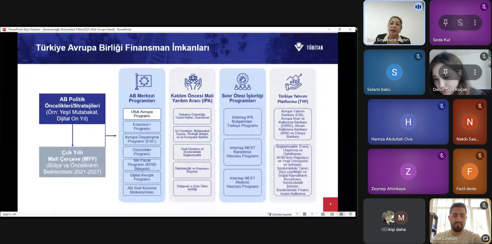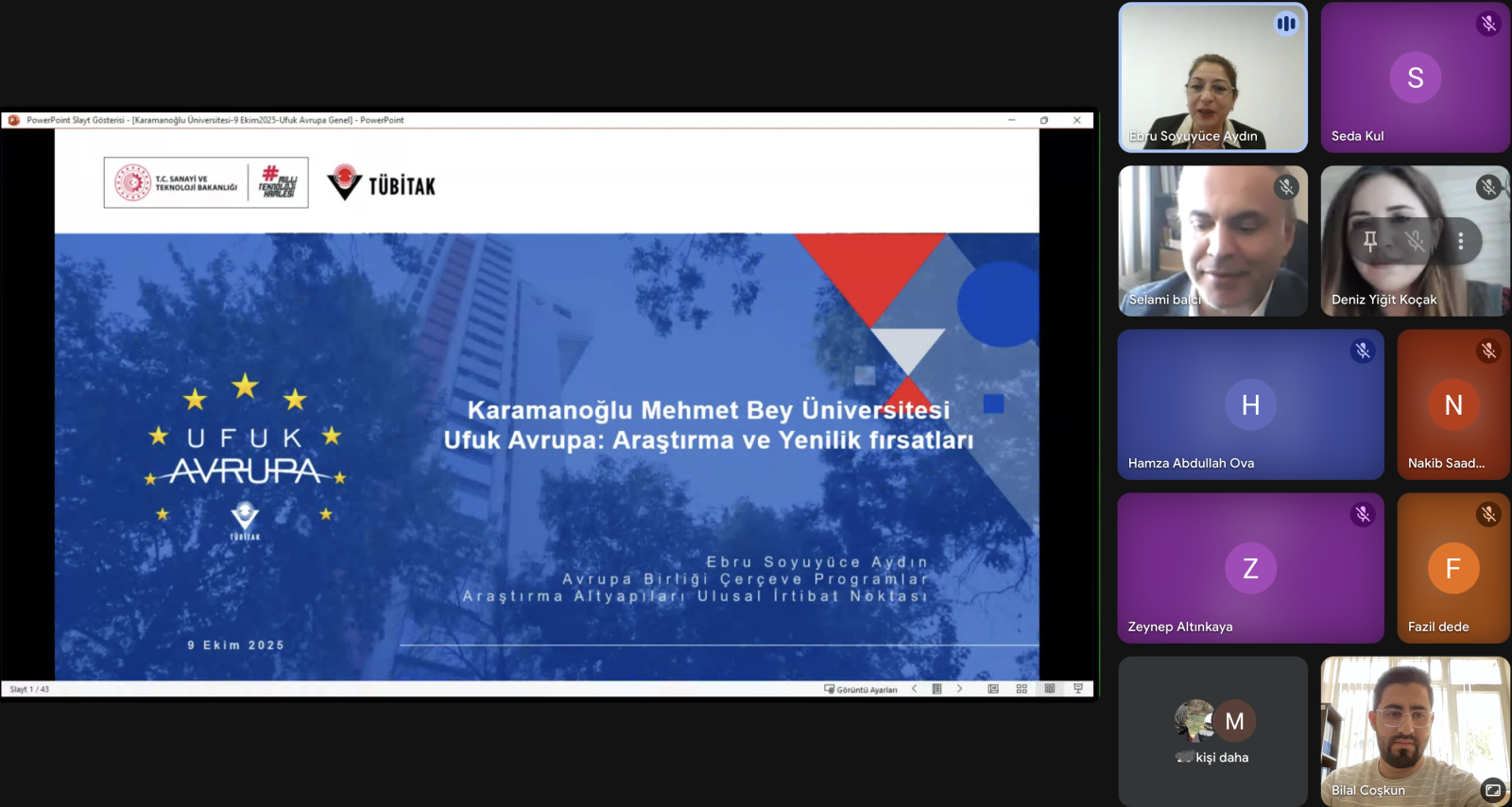 ✅ Karamanoğlu Mehmetbey Üniversitesi KMÜ Proje ve Teknoloji Transfer Ofisi tarafından düzenlenen çevrimiçi “Ufuk Avrupa: Araştırma ve Yenilik Fırsatları” eğitimi, TÜBİTAK AB Çerçeve Programları Müdürlüğü Araştırma Altyapıları Ulusal İrtibat Noktası Ebru Soyuyüce Aydın’ın katılımıyla gerçekleştirildi.