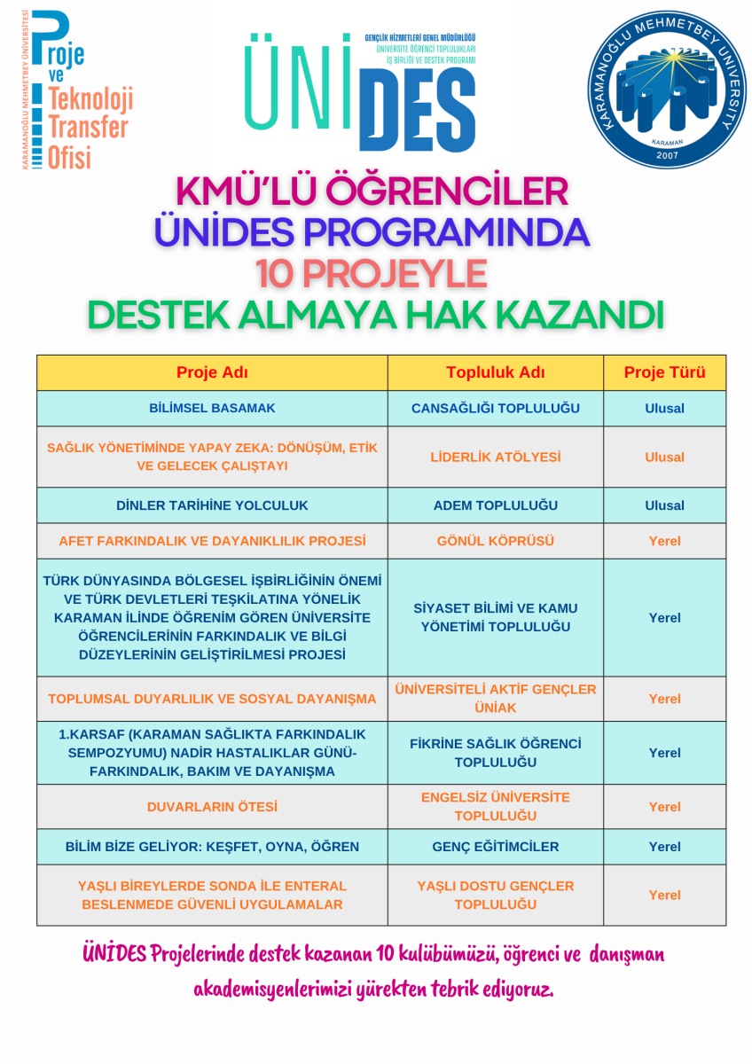 Karamanoğlu Mehmetbey Üniversitesi (KMÜ) öğrencileri, T.C. Gençlik ve Spor Bakanlığı ÜNİDES (Üniversite Öğrenci Toplulukları İş Birliği ve Destek Programı) kapsamında önemli bir başarıya imza attı. KMÜ, toplam 10 öğrenci topluluğu projesiyle hem ulusal hem de yerel düzeyde destek almaya hak kazandı.