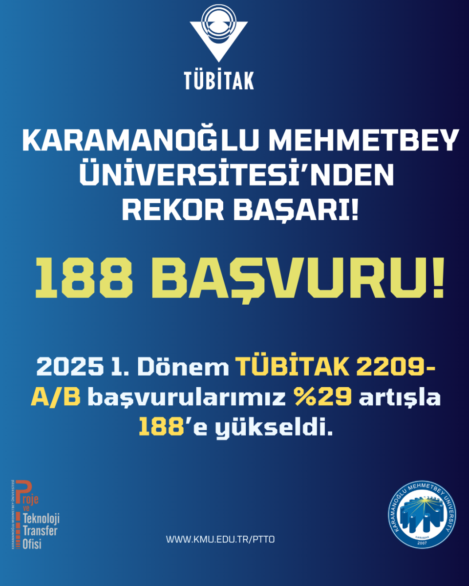 Karamanoğlu Mehmetbey Üniversitesi olarak 2025 1. Dönem TÜBİTAK 2209-A/B başvurularında önemli bir başarıya imza attık.