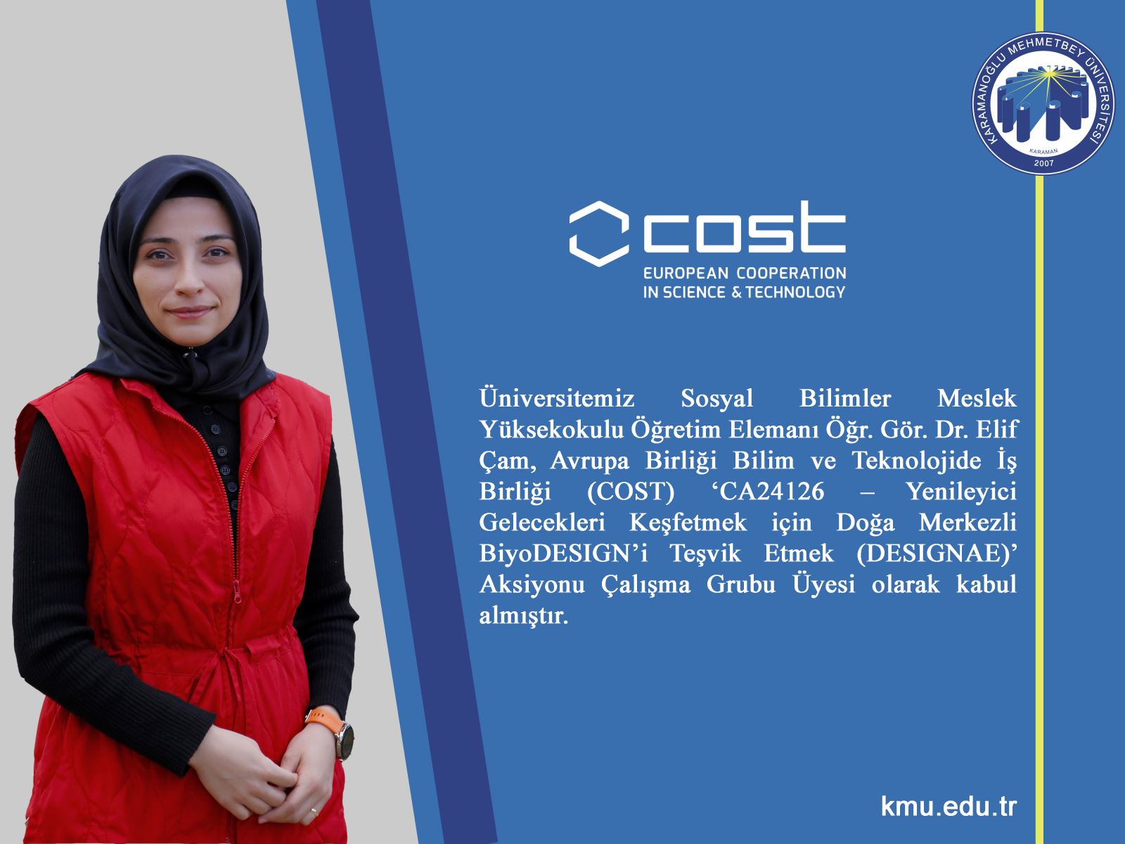 Karamanoğlu Mehmetbey Üniversitesi Sosyal Bilimler Meslek Yüksekokulu öğretim elemanı Öğr. Gör. Dr. Elif Çam, Avrupa Birliği tarafından desteklenen COST (European Cooperation in Science and Technology) Programı kapsamında yürütülen CA24126 – DESIGNAE: “Yenileyici Gelecekleri Keşfetmek İçin Doğa Merkezli BiyoDESIGN’i Teşvik Etmek” aksiyonuna kabul edildi.