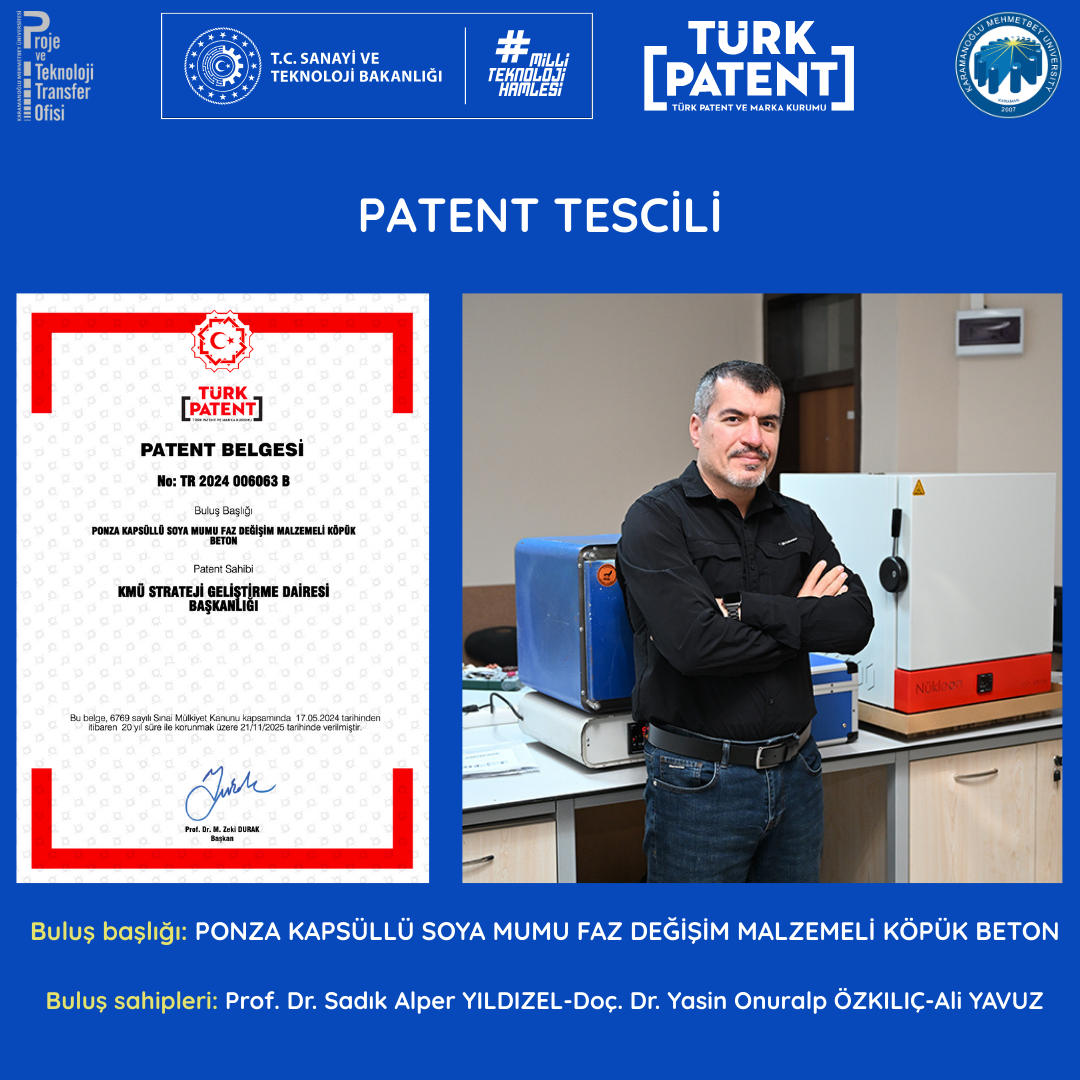 Üniversitemiz Mühendislik Fakültesi Öğretim Üyesi Prof. Dr. Sadık Alper Yıldızel, yüksek lisans öğrencimiz Ali YAVUZ ve Doç. Dr. Yasin Onuralp ÖZKILIÇ’ın ortak buluş sahibi olarak yer aldığı “Ponza Kapsüllü Soya Mumu Faz Değişim Malzemeli Köpük Beton” başlıklı buluş, TÜRKPATENT ve Marka Kurumu tarafından tescil edilmiştir.
