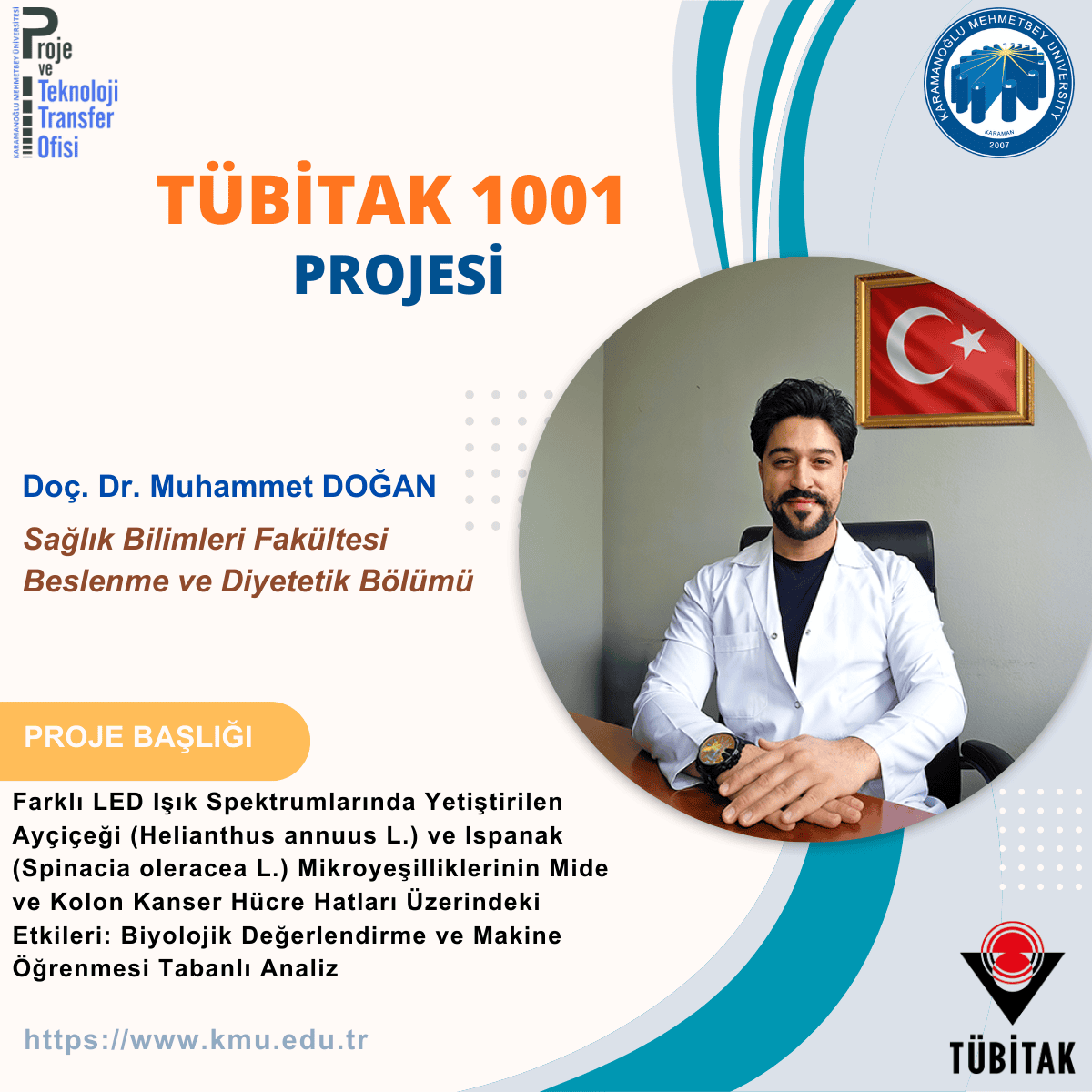 Karamanoğlu Mehmetbey Üniversitesi (KMÜ) Sağlık Bilimleri Fakültesi Beslenme ve Diyetetik Bölümü öğretim üyesi Doç. Dr. Muhammet DOĞAN yürütücülüğünde, “Farklı LED Işık Spektrumlarında Yetiştirilen Ayçiçeği (Helianthus annuus L.) ve Ispanak (Spinacia oleracea L.) Mikroyeşilliklerinin Mide ve Kolon Kanser Hücre Hatları Üzerindeki Etkileri: Biyolojik Değerlendirme ve Makine Öğrenmesi Tabanlı Analiz” başlıklı proje TÜBİTAK 1001 programı kapsamında desteklenmeye hak kazandı.