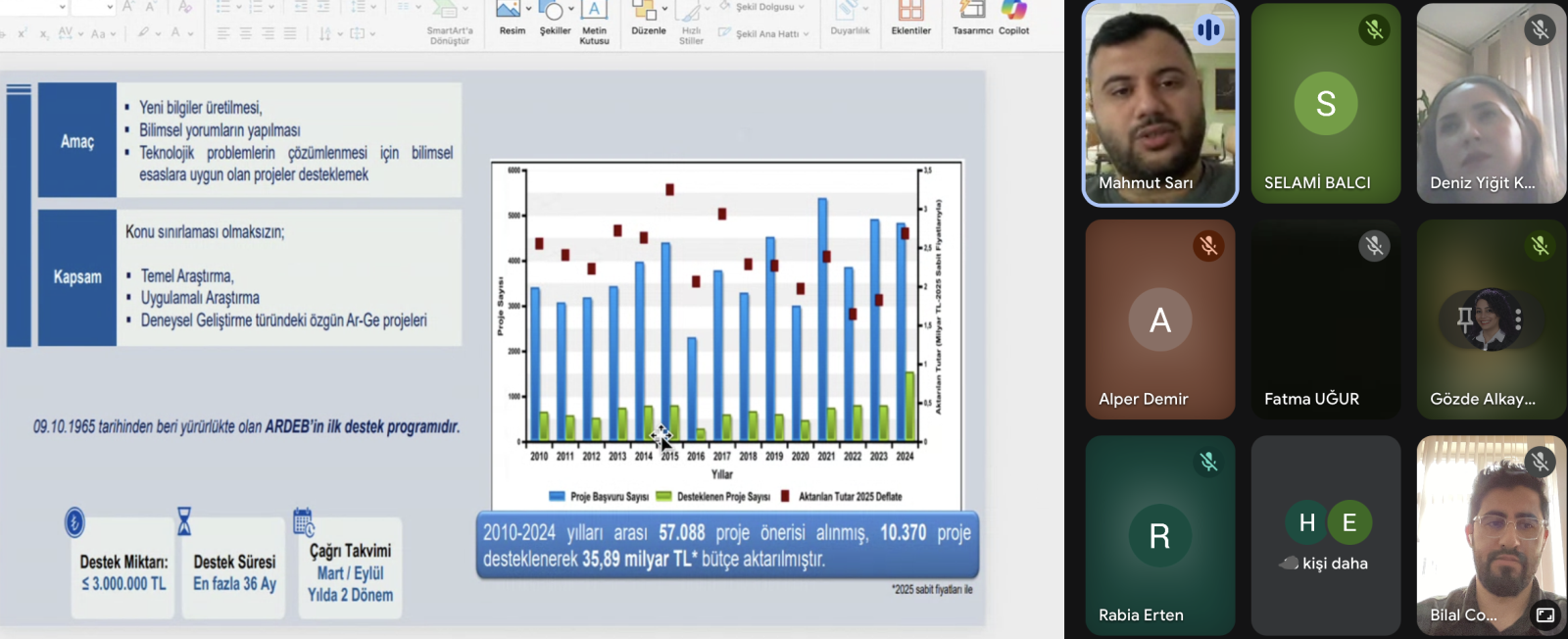 Çevrimiçi düzenlenen eğitime, üniversitemiz bünyesindeki akademisyenler ve araştırmacılar yoğun ilgi gösterdi. Etkileşimli olarak yürütülen eğitim süresince katılımcıların soruları yanıtlanırken, başarılı proje başvurularına yönelik uygulamaya dönük bilgi ve deneyimler paylaşıldı.