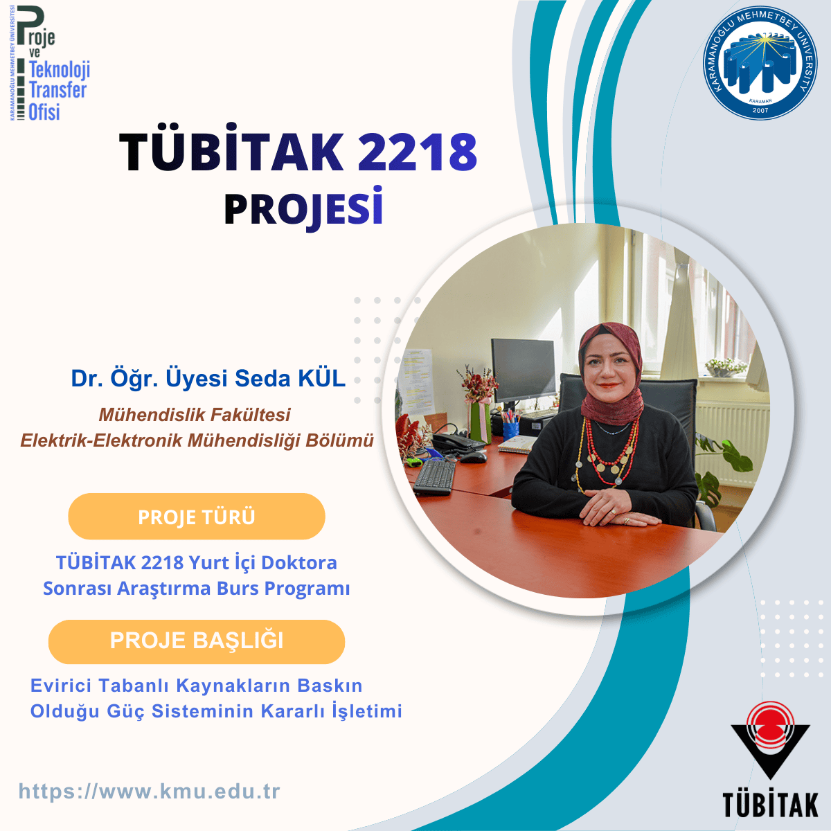 Karamanoğlu Mehmetbey Üniversitesi Mühendislik Fakültesi Elektrik-Elektronik Mühendisliği Bölümü öğretim elemanı Dr. Öğr. Üyesi Seda Kül, Ph.D., TÜBİTAK 2218 Yurt İçi Doktora Sonrası Araştırma Burs Programı kapsamında sunduğu projesiyle destek almaya hak kazandı.