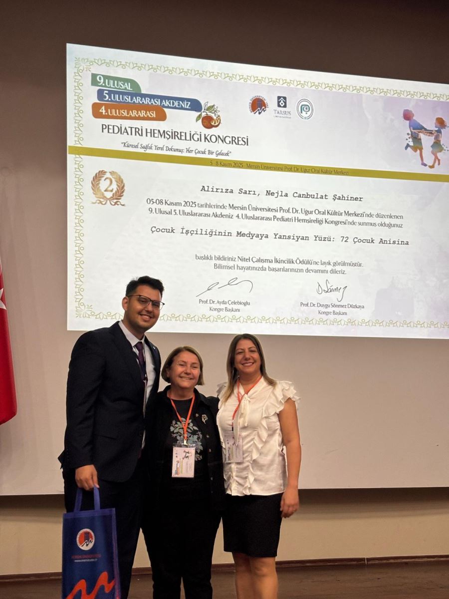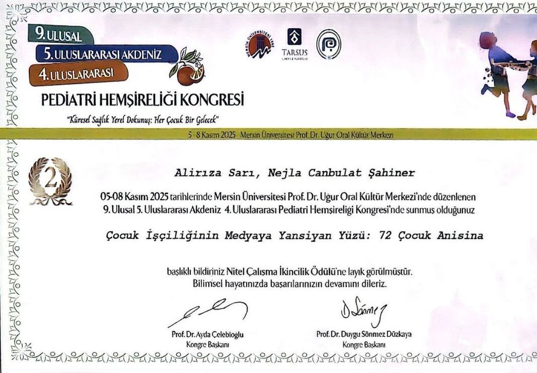 Öğrencimiz Alirıza SARI ile Çocuk Sağlığı ve Hastalıkları Hemşireliği Anabilim Dalı öğretim üyelerinden Prof. Dr. Nejla CANBULAT ŞAHİNER tarafından hazırlanan “Çocuk İşçiliğinin Medyaya Yansıyan Yüzü: 72 Çocuk Anısına” başlıklı bildiri, 05–08 Kasım 2025 tarihleri arasında gerçekleştirilen kongrede “Sözel Bildiri Nitel Çalışma İkincilik Ödülü”ne layık görüldü.