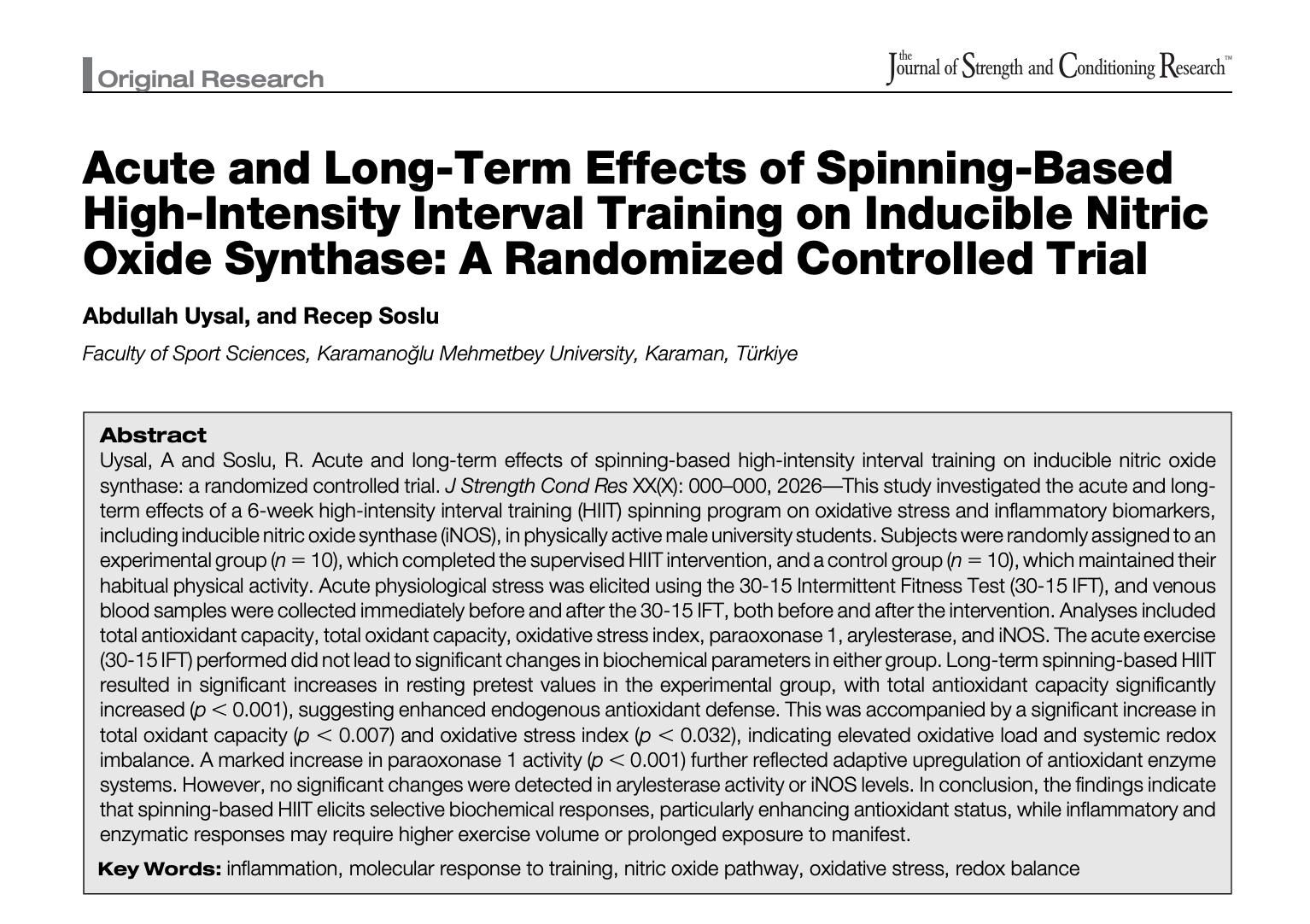 Enstitümüz Antrenörlük Eğitimi Anabilim Dalı lisansüstü öğrencisi ve aynı zamanda Spor Bilimleri Fakültesi’nde Araştırma Görevliliği yapan Abdullah UYSAL'ın yüksek lisans tezinden üretmiş olduğu makalesi Journal of Strength and Conditioning Research dergisinde (SCI / Q1) yayımlandı. Danışmanlığını, Antrenörlük Eğitimi Anabilim Dalı’ndan Doç. Dr. Recep Soslu'nun yürüttüğü çalışmanın başlığı "Acute and Long-Term Effects of Spinning-Based High-Intensity Interval Training on Inducible Nitric Oxide Synthase: A Randomized Controlled Trial" şeklindedir. Öğrencimizi ve danışman hocamızı tebrik eder, başarılarının devamını dileriz.