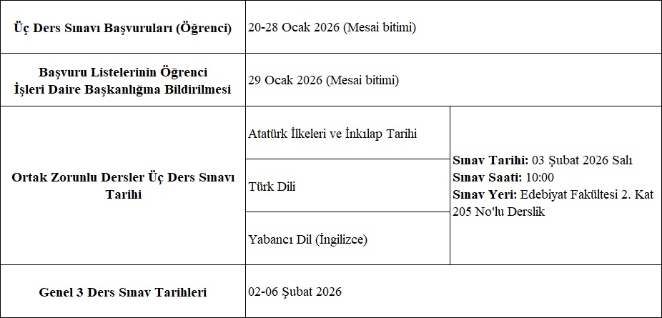 2025-2026 EĞİTİM ÖĞRETİM YILI GÜZ YARIYILI ÜÇ DERS SINAVLARI UYGULAMA TAKVİMİ