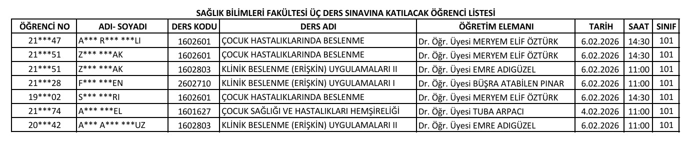 2025-2026 Eğitim Öğretim Yılı Güz Yarıyılı Üç Ders Sınavına Girecek Öğrenci Listesi