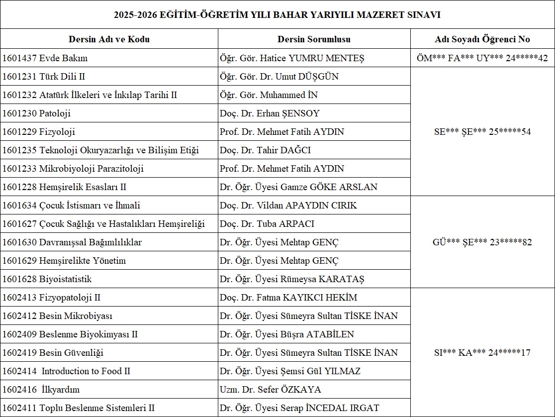 Tabloda yer alan öğrencilerimiz ders sorumluları ile görüşerek 04-08 Mayıs 2026 tarihleri arasında mazeret sınavına katılacaklardır.