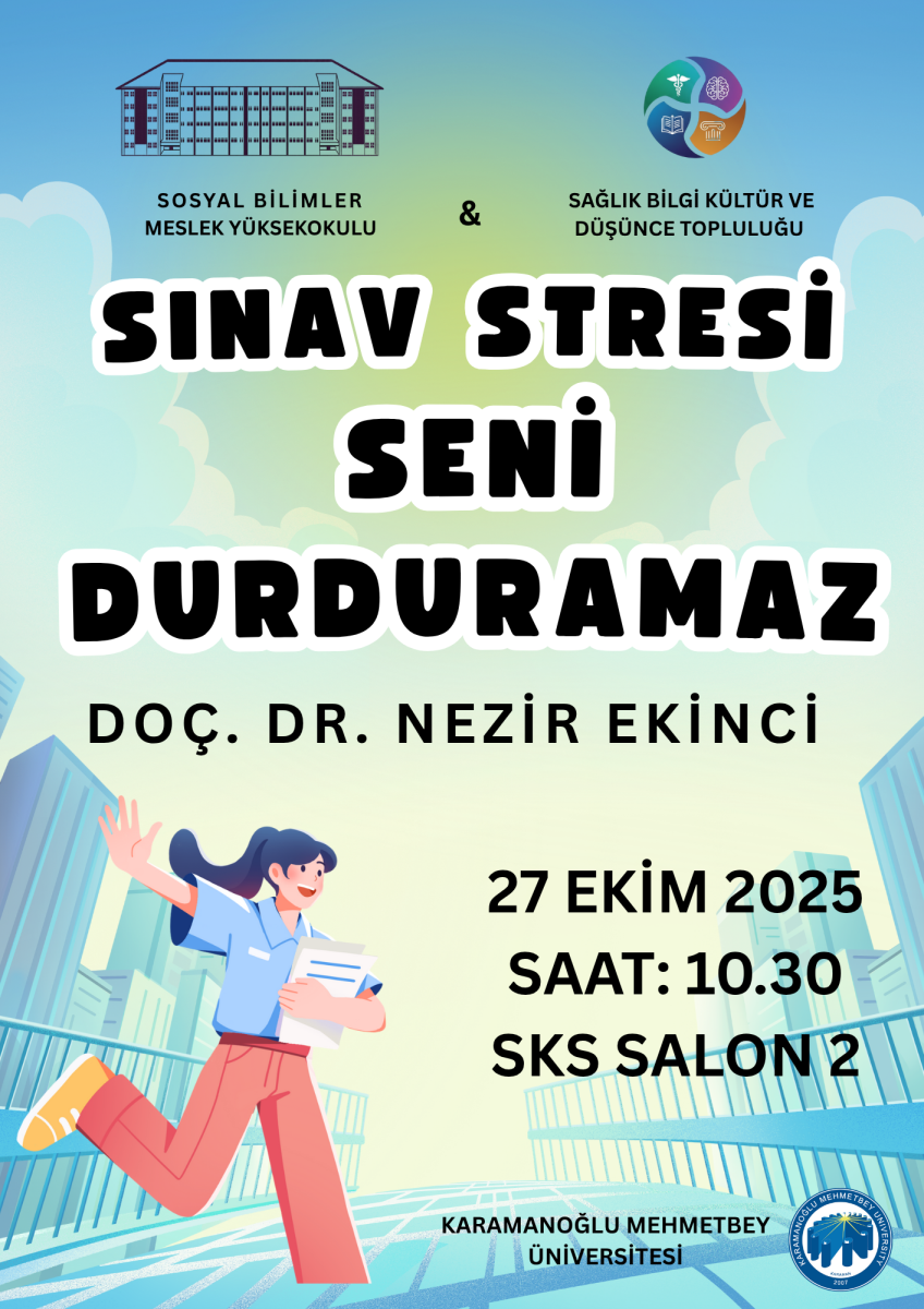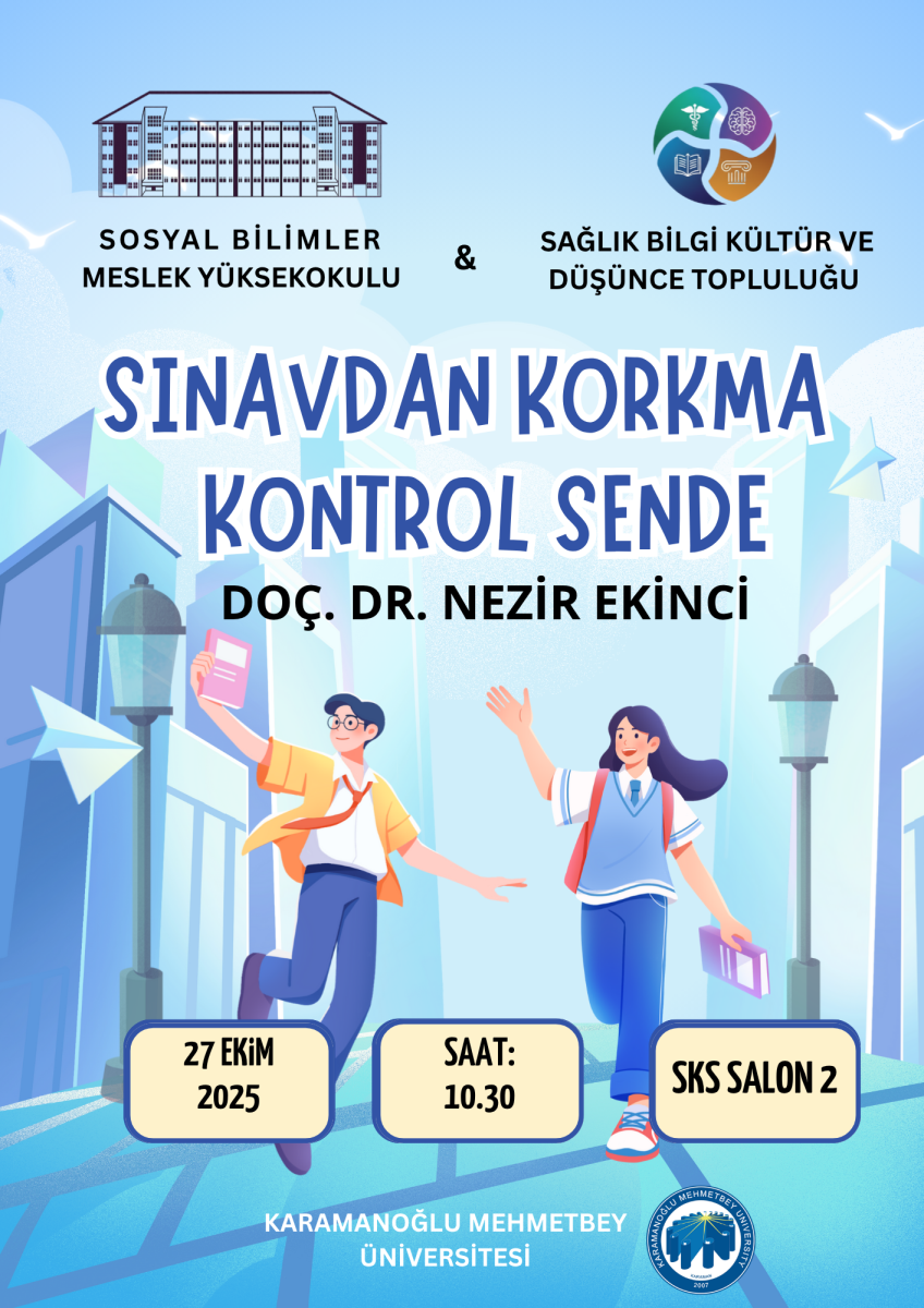 Karamanoğlu Mehmetbey Üniversitesi Sosyal Bilimler Meslek Yüksekokulu ve Sağlık, Bilgi, Kültür ve Düşünce Topluluğu tarafından düzenlenen “Sınavdan Korkma, Kontrol Sende” başlıklı söyleşimize tüm öğrencilerimiz davetlidir.