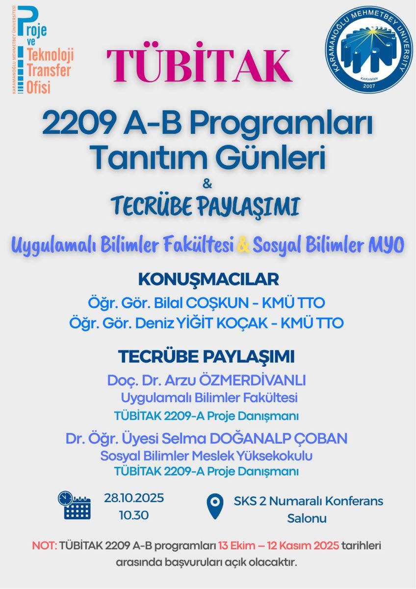 Karamanoğlu Mehmetbey Üniversitesi Proje ve Teknoloji Transfer Ofisi (KMÜ TTO) tarafından TÜBİTAK 2209 A-B Programları Tanıtım Günleri ve Tecrübe Paylaşımı etkinliği düzenlenecek.