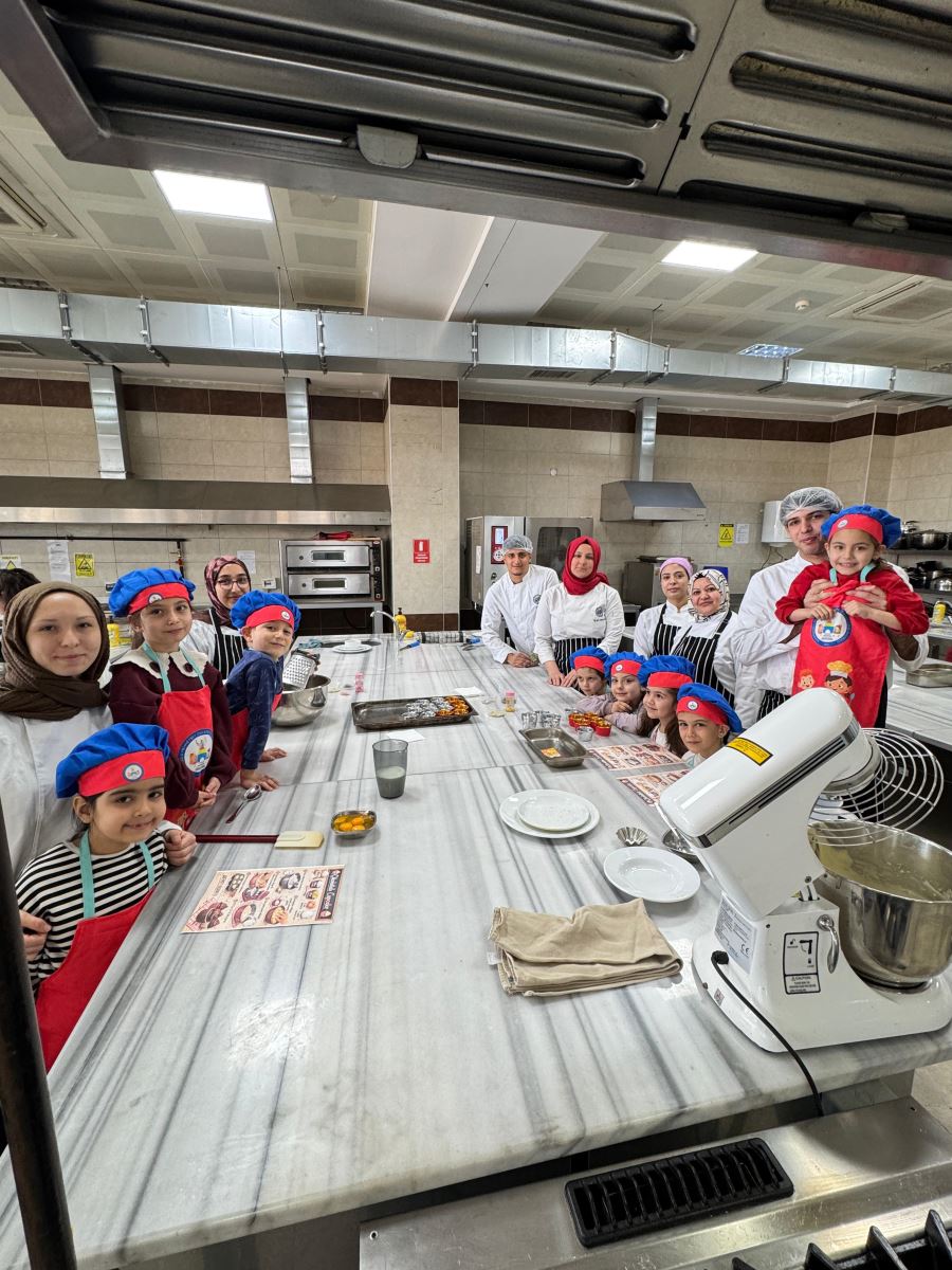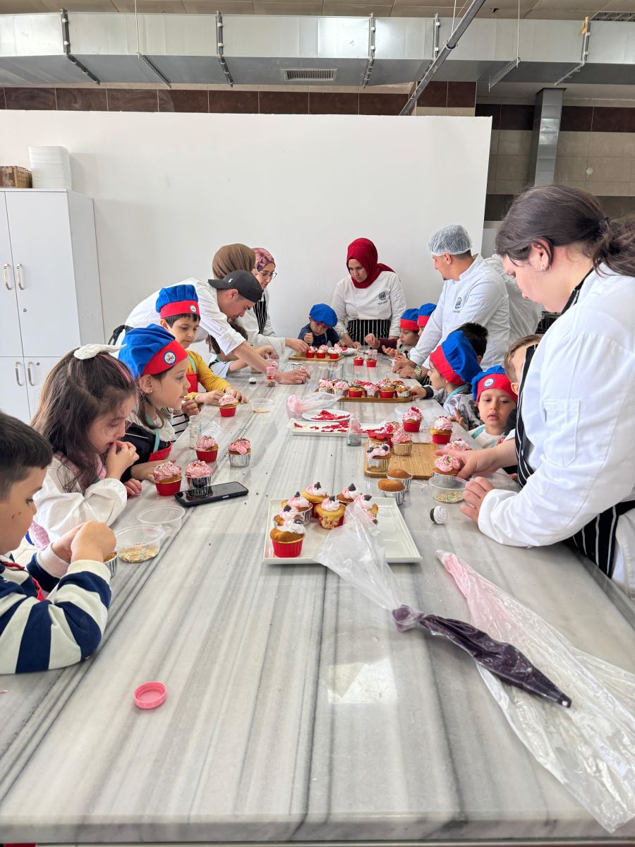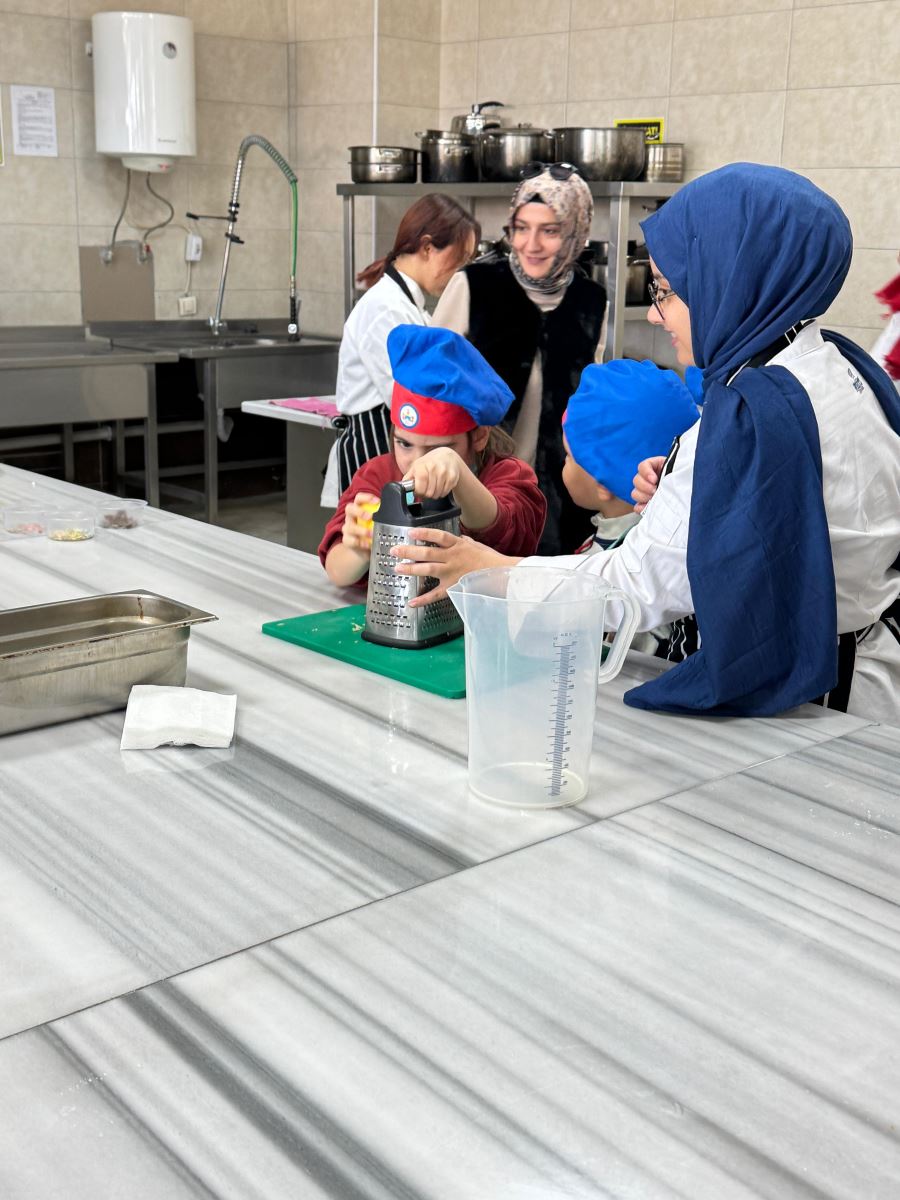 Renkli görüntülere sahne olan etkinlikte, çocukların mutfak becerilerini geliştirmelerine katkı sağlanırken, üniversite öğrencileri için de sosyal sorumluluk ve uygulamalı eğitim açısından önemli bir deneyim elde edildi.