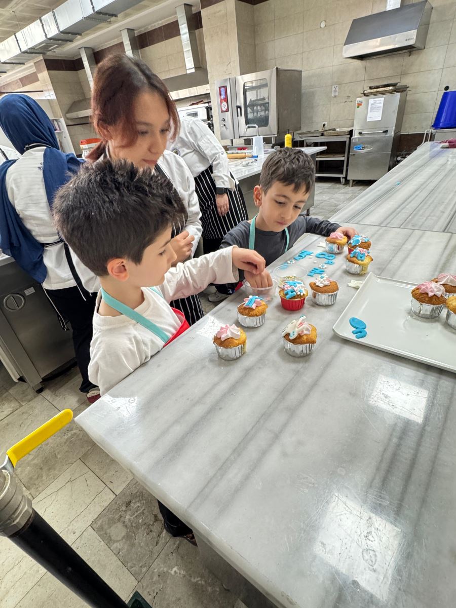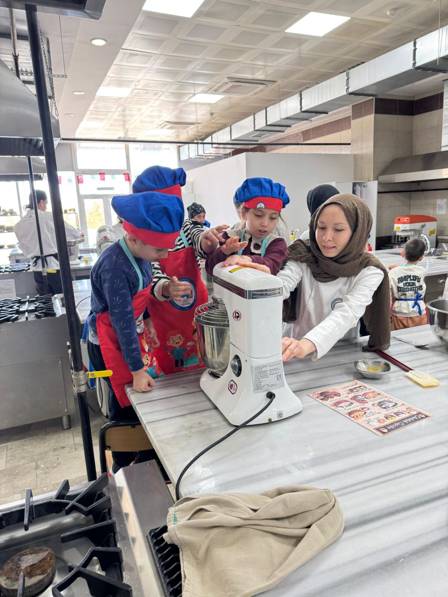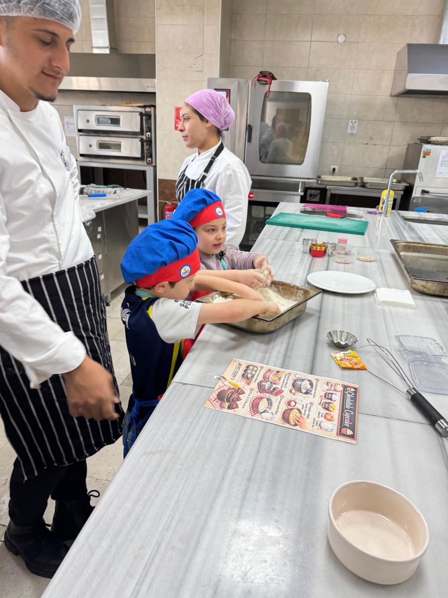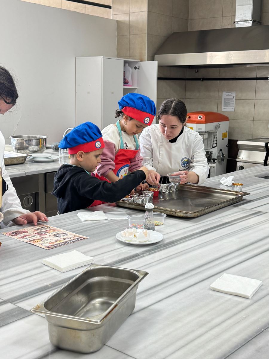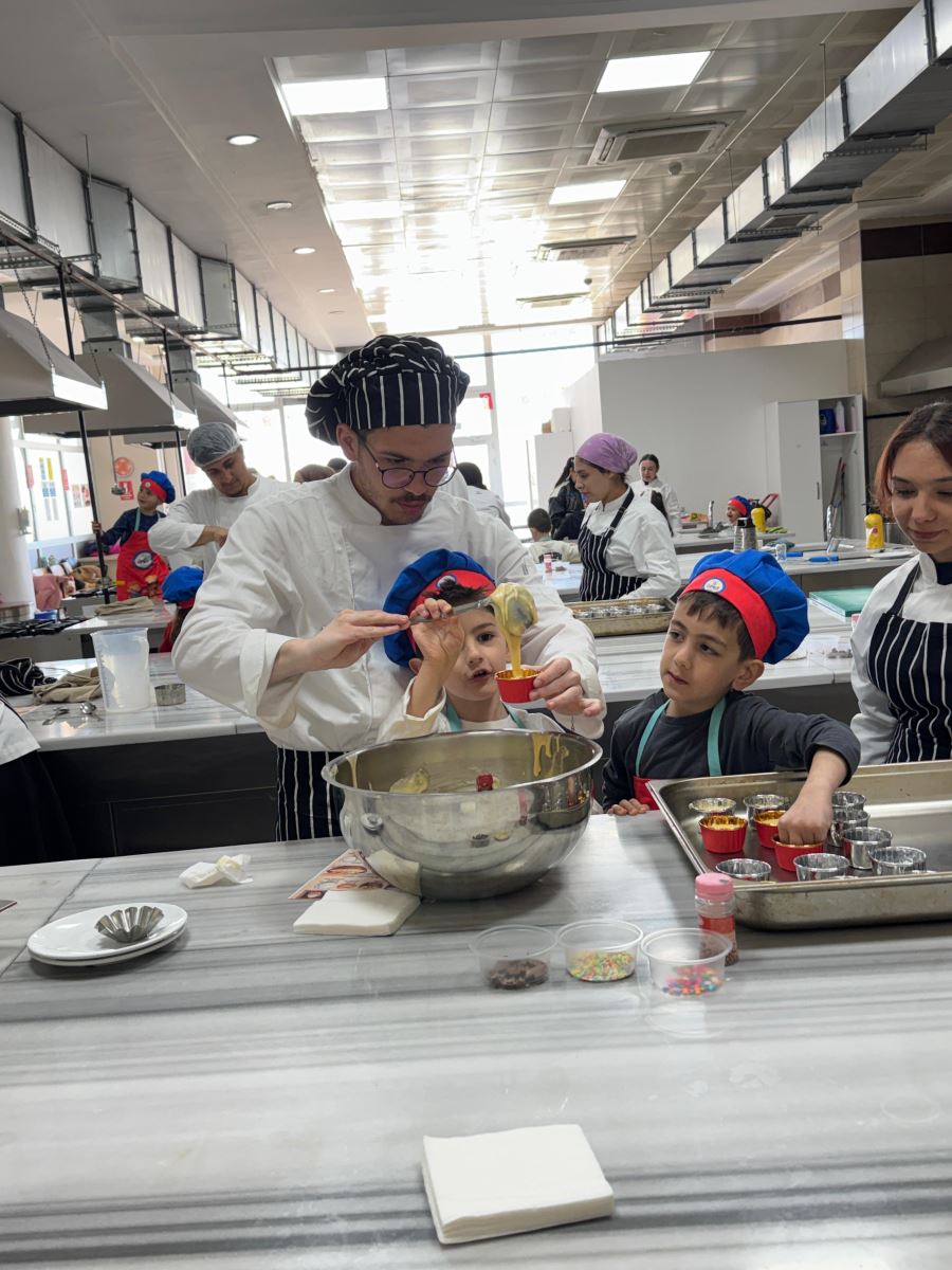 Etkinlik kapsamında, Öğretim Görevlisi Zeynep Çınar öncülüğünde Pastacılık ve Ekmekçilik Programı öğrencilerinin rehberliğinde minik misafirlerle birlikte pasta yapımı gerçekleştirildi. Hem eğlenen hem de yeni şeyler öğrenen öğrenciler, uygulamalı bir deneyim yaşama fırsatı buldu.