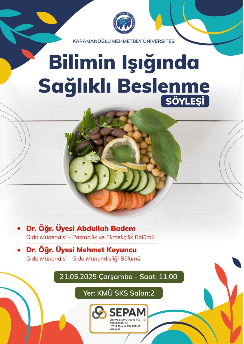 Karamanoğlu Mehmetbey Üniversitesi Sosyal Ekonomik ve Politik Araştırmalar Uygulama ve Araştırma Merkezi (SEPAM) tarafından SKS-2 salonunda,“Bilimin Işığında Sağlıklı Beslenme” konulu söyleşi düzenlenecektir.