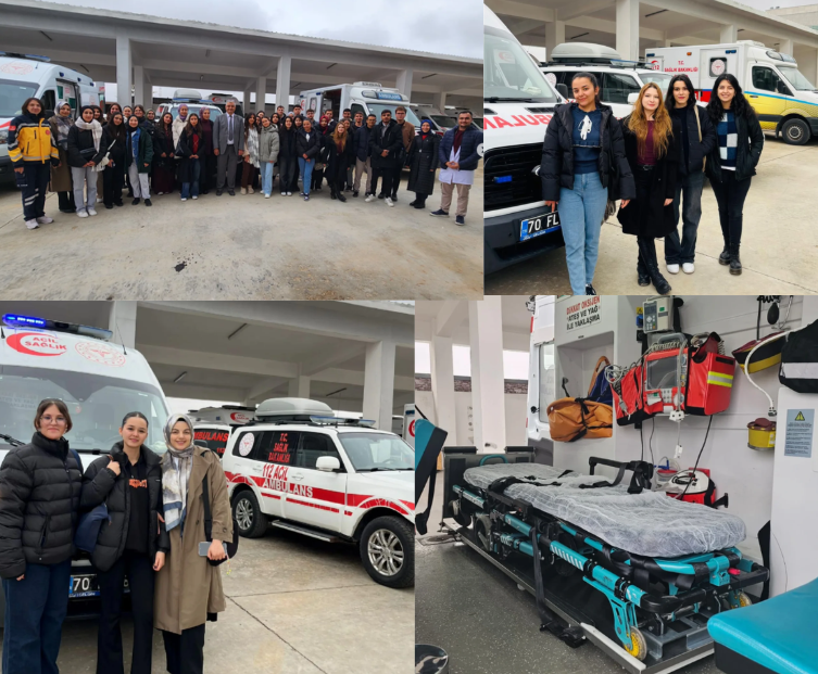 Sağlık Odaklı Spor ve Faaliyet Topluluğu ile İlk ve Acil Yardım Programı iş birliğinde, 1. Sınıf öğrencilere özel donanımlı ambulansların tanıtımını gerçekleştirmek amacıyla Karaman İl Ambulans Servisi Başhekimliğine 08.12.2025 tarihinde teknik bir gezi düzenlenmiştir. Etkinlik kapsamında öğrencilerin ambulans donanımları, acil müdahale ekipmanları ve saha uygulamalarına ilişkin bilgi düzeylerini artırmaya yönelik incelemelerde bulunmaları sağlanmıştır.