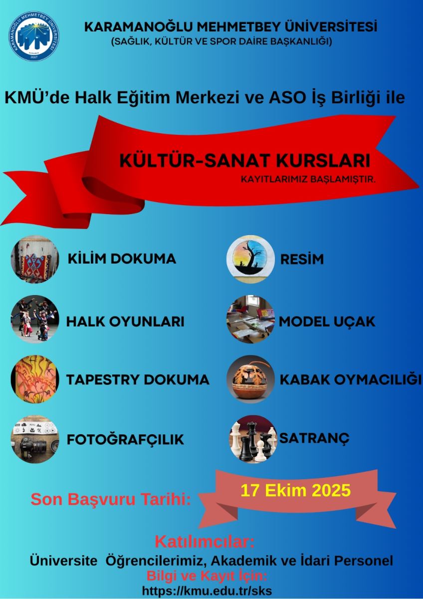 Üniversitemiz Akademik ve İdari personeli ile öğrencilerimize yönelik kültür ve sanat kursları açılacaktır. Müracaatlar 17 Ekim 2025 Cuma gününe kadar yapılacak olup, kurs başvuru formu doldurularak sks@kmu.edu.tr adresine gönderilmesi gerekmektedir.