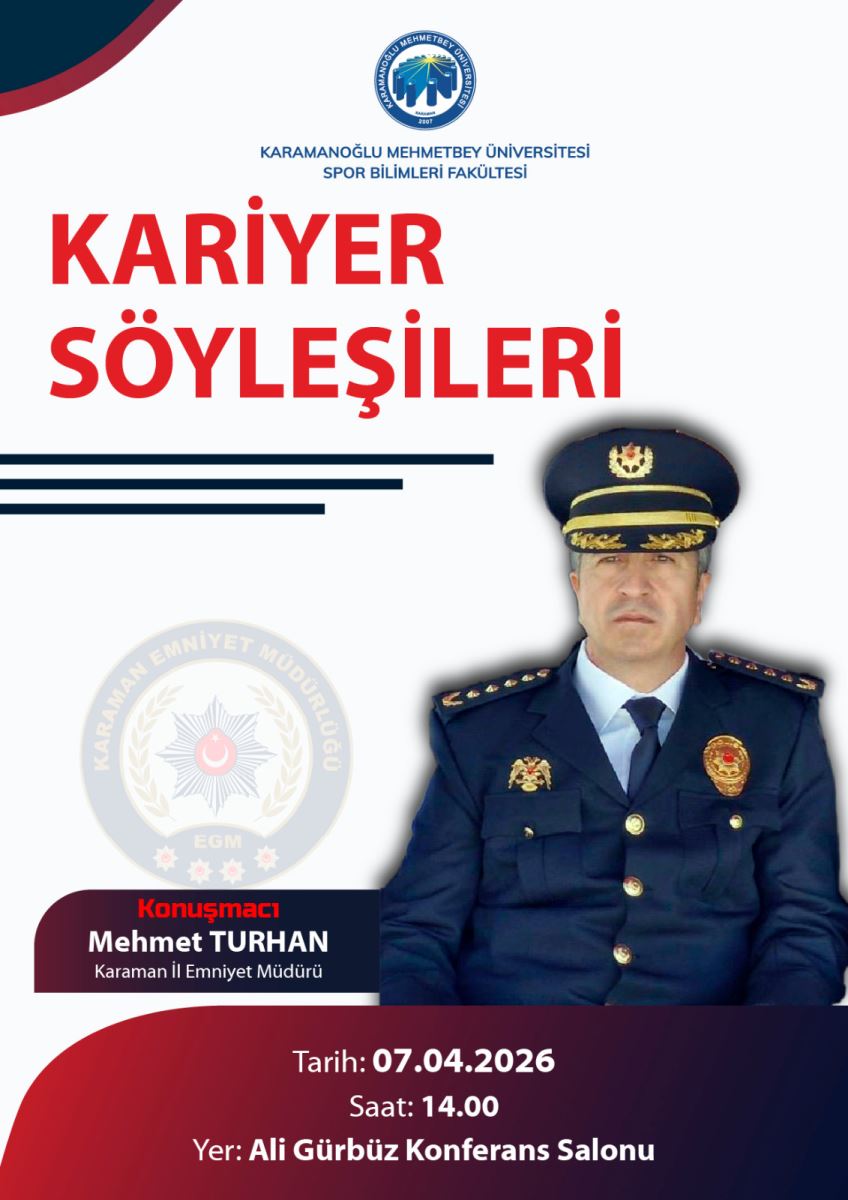 Fakültemiz Ali Gürbüz Konferans Salonunda 07.04.2026 Salı günü saat 14.00'de Karaman İl Emniyet Mehmet TURHAN'ın katılımıyla "Kariyer Söyleşileri" programı yapılacaktır.