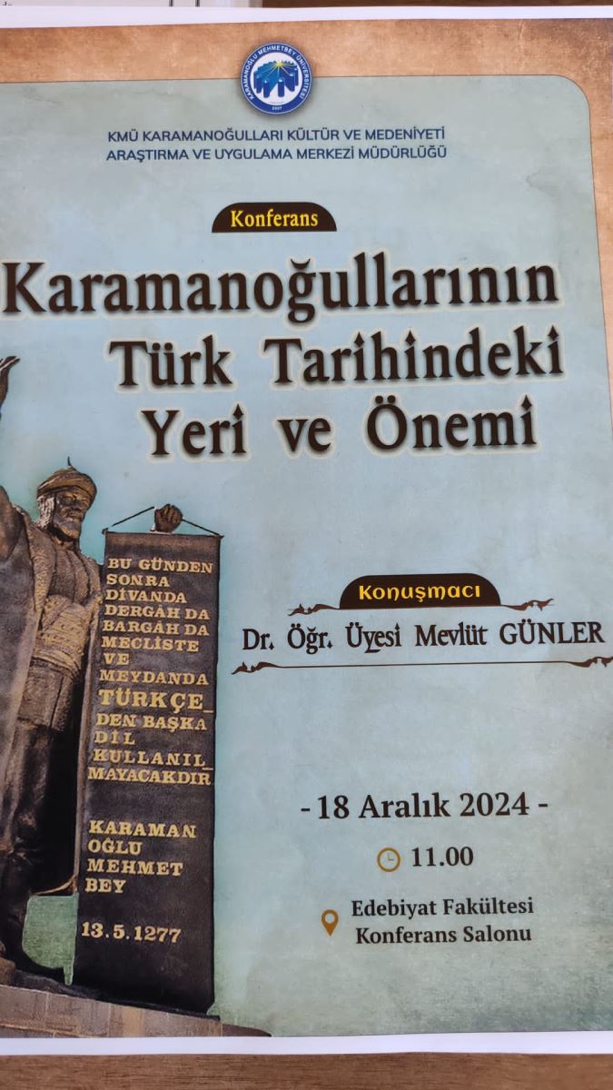Tarih Bölümü Öğretim Üyesi Dr. Öğr. Ü. Mevlüt Günler, Karamanoğullarının Türk Tarihindeki Yeri ve Önemi Konusunda konferans verdi. Dr. Öğr. Ü. Mevlüt Günler konuşmasında "Karamanoğulları Beyliği, Oğuz Afşar boyundan Kerimüddin Karaman Bey tarafından Toroslar’da kurulmuş, Larende merkezli olarak Konya’yı ele geçirip “Anadolu’nun hakimi” unvanını kullanmış, Türkçe’yi fermanla resmî dil ilan ederek Türk kimliğinin siyasî bayraktarlığını üstlenmiştir. Liman ticareti, Türkmen süvari ordusu ve İlhanlılara karşı ittifak siyasetiyle geniş bir alanda Osmanlı’ya rakip olmuş, nihayet ilhak edilerek Anadolu Türk birliğinin tamamlanmasında kritik rol oynamıştır." şeklindeki bazı düşüncelerini dile getirdikten sonra konferans sonlandırıldı.