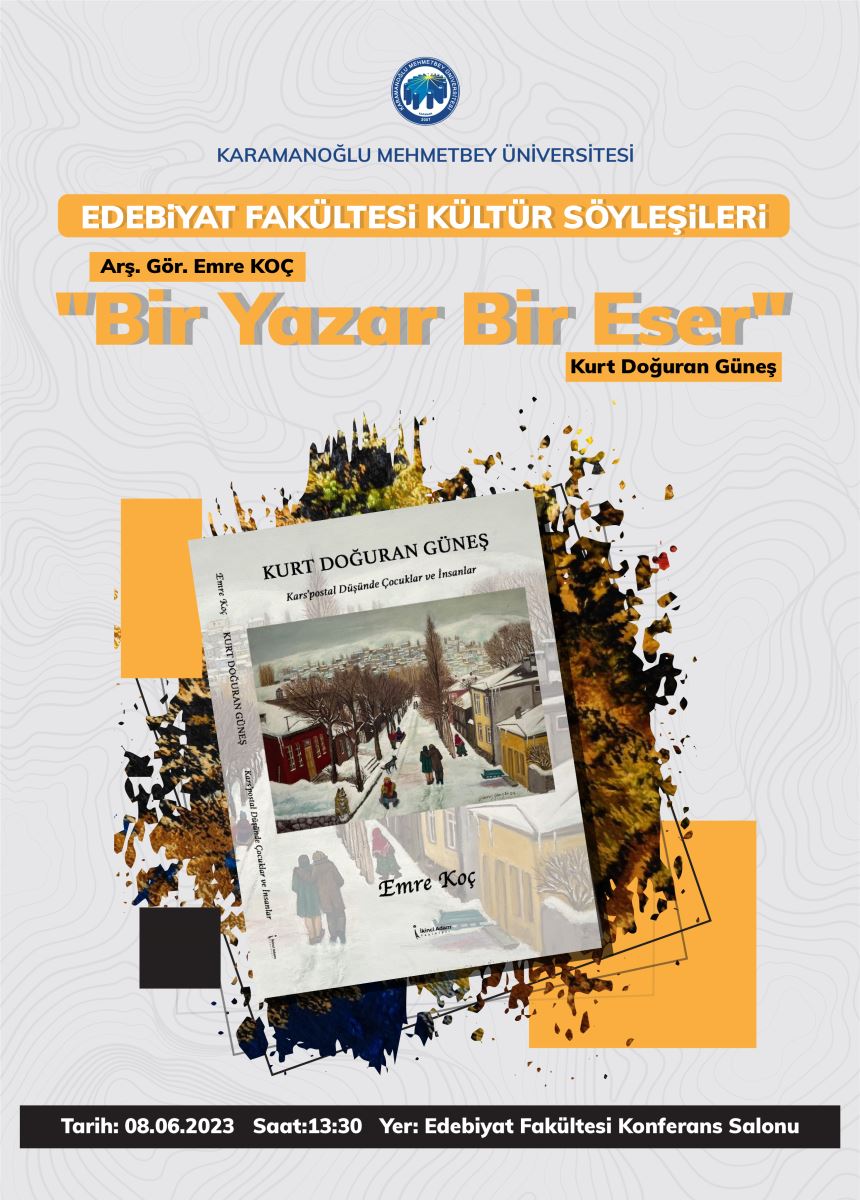 Edebiyat Fakültesi Kültür Söyleşileri kapsamından Tarih Bölümü Öğretim Elemanı Arş. Gör. Emre Koç "Kurt Doğuran Güneş" adlı eserini anlatmak üzere 6 Haziran 2023 tarihinde Edebiyat Fakültesi Konferans Salonunda konferans düzenledi. Arş. Gör. Emre Koç romanını dair bilgileri aktardıktan sonra konferans sona erdi.