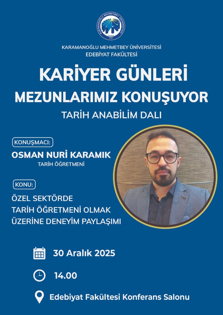 Within the scope of activities carried out by the Graduation, Alumni Guidance, and Career Planning Commission of the Department of History at Karamanoğlu Mehmetbey University (KMÜ), 2015 graduate Osman Nuri Karamık delivered a talk titled “Experience Sharing on Being a History Teacher in the Private Sector.”