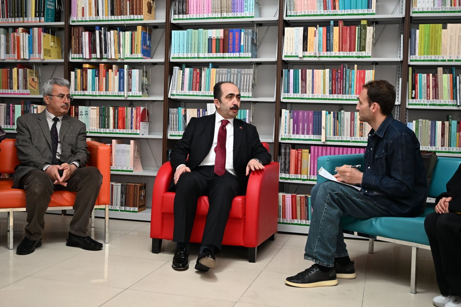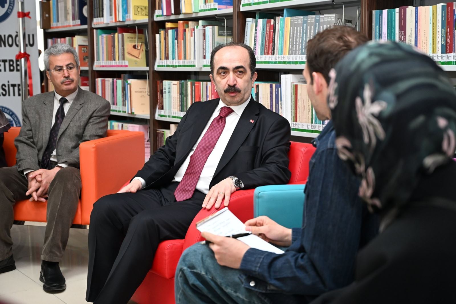 Açılış programının ardından akademik personel ve öğrencilerle bir araya gelen Prof. Dr. Yüksel Özgen, tarih bölümü öğrencilerinin tarih eğitimine ve tarihçilik mesleğine ilişkin sorularını yanıtladı. Tarih Bölümü yüksek lisans öğrencilerinden Enes Şahinbaş, Prof. Dr. Özgen ile yaptığı mülakatta “Türk Tarih Kurumu, ülkemizin yurtdışında tanıtılması ve “yumuşak gücümüz” olarak ifade edilen kamu diplomasisi alanında ne tür faaliyetler yürütmektedir?” sorusunu yöneltmiş Sayın Özgen ise “Türk Tarih Kurumu, Türkiye’nin tarihî birikimini uluslararası platformlarda tanıtmak amacıyla aktif çalışmalar yürütmektedir. Özellikle 2025 yılı içerisinde yurtdışında toplam 25 adet konferans, sempozyum ve akademik etkinlik düzenlenmiştir. Bu etkinliklerde hem Türk tarihine dair bilimsel veriler paylaşılmış hem de ülkemizin tarihsel tezleri akademik çerçevede savunulmuştur” şeklinde cevap vermiştir. Enes Bey’in yönelttiği bir başka soru Türk Tarih Kurumu’nun tarih bölümü öğrencilerine ne tür imkânlar sunduğu ile ilgili olmuştur. Sayın Özgen bu soruya “Türk Tarih Kurumu, tarih alanında eğitim gören öğrencilere çeşitli akademik destekler sağlamaktadır. Bu kapsamda lisans, yüksek lisans ve doktora düzeyinde burslar verilmektedir. Bu burslar, öğrencilerin akademik çalışmalarını daha rahat sürdürebilmelerine katkı sağlamaktadır. Ayrıca kurum, yayımladığı kitap ve dergileri uygun fiyatlarla kamuya sunarak bilgiye erişimi kolaylaştırmaktadır. Bunun yanında arşiv ve kütüphane imkânları, araştırmacıların hizmetine açılmakta genç tarihçilerin bilimsel üretime katılımı teşvik edilmektedir.” şeklinde cevaplamıştır. Enes Şahinbaş son olarak “Sözde Ermeni Soykırımı ile ilgili olarak Türk Tarih Kurumu yurtdışında hangi çalışmaları yürütmektedir?” sorusunu sormuştur. Prof. Dr. Yüksel Özgen “Türk Tarih Kurumu, bu konuda uluslararası alanda akademik temelli çalışmalar yürütmektedir. Özellikle yurtdışı konferansları, sempozyumlar ve bilimsel yayınlar aracılığıyla Türkiye’nin görüşleri ve tarihsel tezleri anlatılmaktadır. Alanında uzman tarihçiler tarafından hazırlanan makale ve kitaplar, farklı dillere çevrilerek uluslararası akademik çevrelere sunulmaktadır. Böylece konunun bilimsel zeminde ele alınması sağlanmakta ve Türkiye’nin perspektifi dünya kamuoyuna aktarılmaktadır.” cevabını vermiştir.