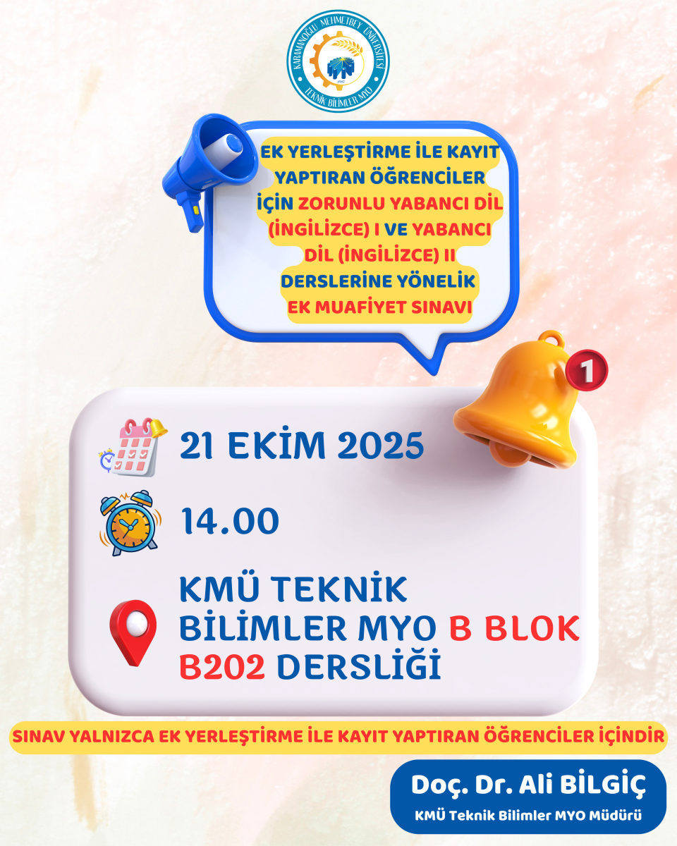 Yüksekokulumuza Ek Yerleştirme ile kayıt yaptıran öğrenciler için Zorunlu Yabancı Dil (İngilizce) I ve Yabancı Dil (İngilizce) II derslerine yönelik Ek Muafiyet Sınavı, 21.10.2025 tarihinde saat 14.00’te Yüksekokulumuz B Blok B202 dersliğinde yapılacaktır.