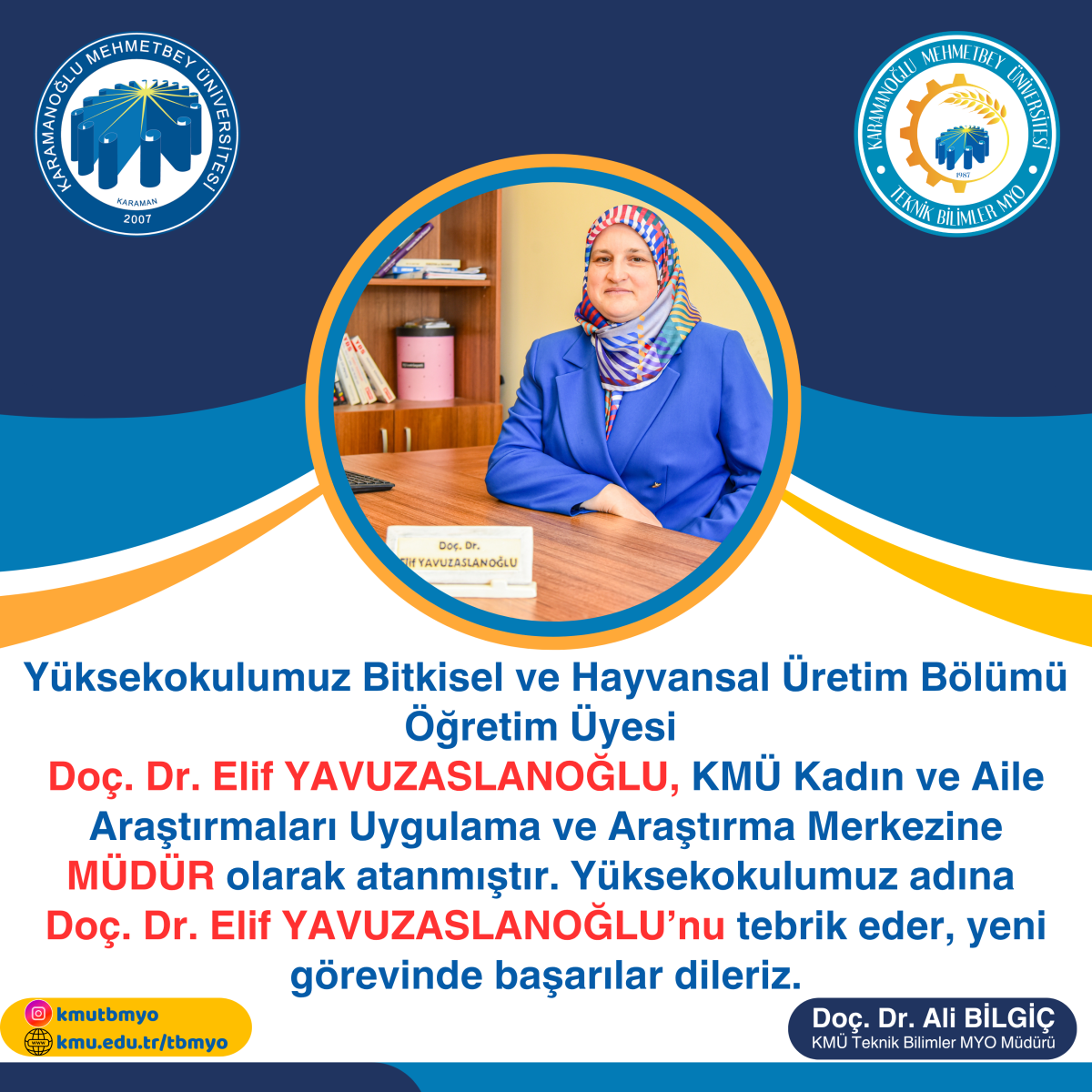 Yüksekokulumuz Bitkisel ve Hayvansal Üretim Bölümü Öğretim Üyesi Doç. Dr. Elif YAVUZASLANOĞLU, KMÜ Kadın ve Aile Araştırmaları Uygulama ve Araştırma Merkezine MÜDÜR olarak atanmıştır.