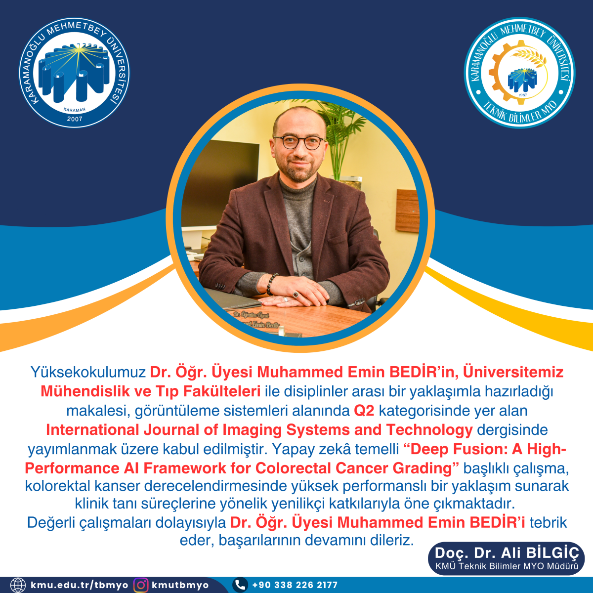 Yüksekokulumuz Dr. Öğr. Üyesi Muhammed Emin BEDİR’in,Üniversitemiz Mühendislik ve Tıp Fakülteleri ile disiplinler arası bir yaklaşımla hazırladığı makalesi, görüntüleme sistemleri alanında Q2 kategorisinde yer alan International Journal of Imaging Systems and Technology dergisinde yayımlanmak üzere kabul edilmiştir. Yapay zekâ temelli “Deep Fusion: A High-Performance AI Framework for Colorectal Cancer Grading” başlıklı çalışma, kolorektal kanser derecelendirmesinde yüksek performanslı bir yaklaşım sunarak klinik tanı süreçlerine yönelik yenilikçi katkılarıyla öne çıkmaktadır.
