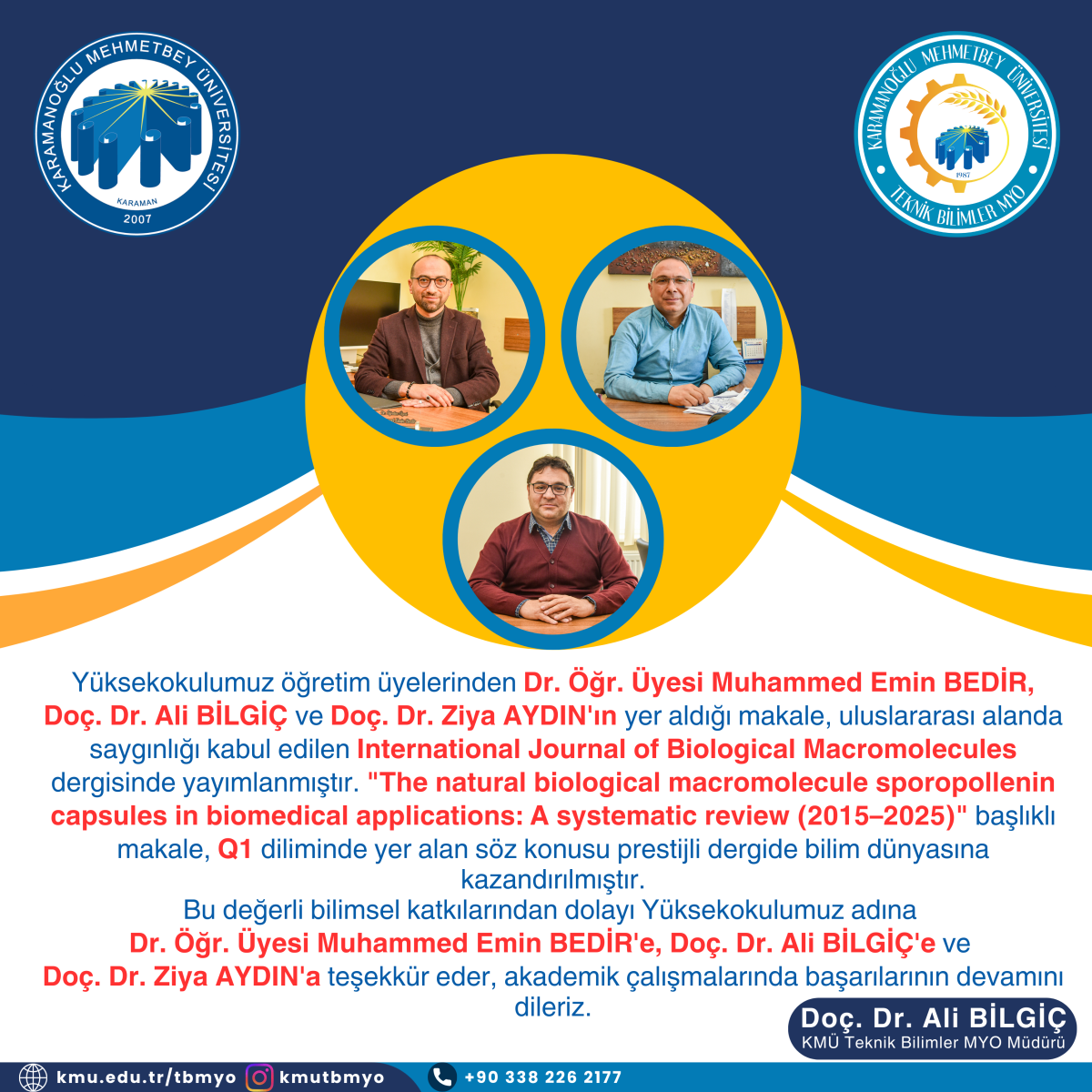 Yüksekokulumuz öğretim üyelerinden Dr. Öğr. Üyesi Muhammed Emin BEDİR, Doç. Dr. Ali BİLGİÇ ve Doç. Dr. Ziya AYDIN'ın yer aldığı makale, uluslararası alanda saygınlığı kabul edilen International Journal of Biological Macromolecules dergisinde yayımlanmıştır. "The natural biological macromolecule sporopollenin capsules in biomedical applications: A systematic review (2015–2025)" başlıklı makale, Q1 diliminde yer alan söz konusu prestijli dergide bilim dünyasına kazandırılmıştır.