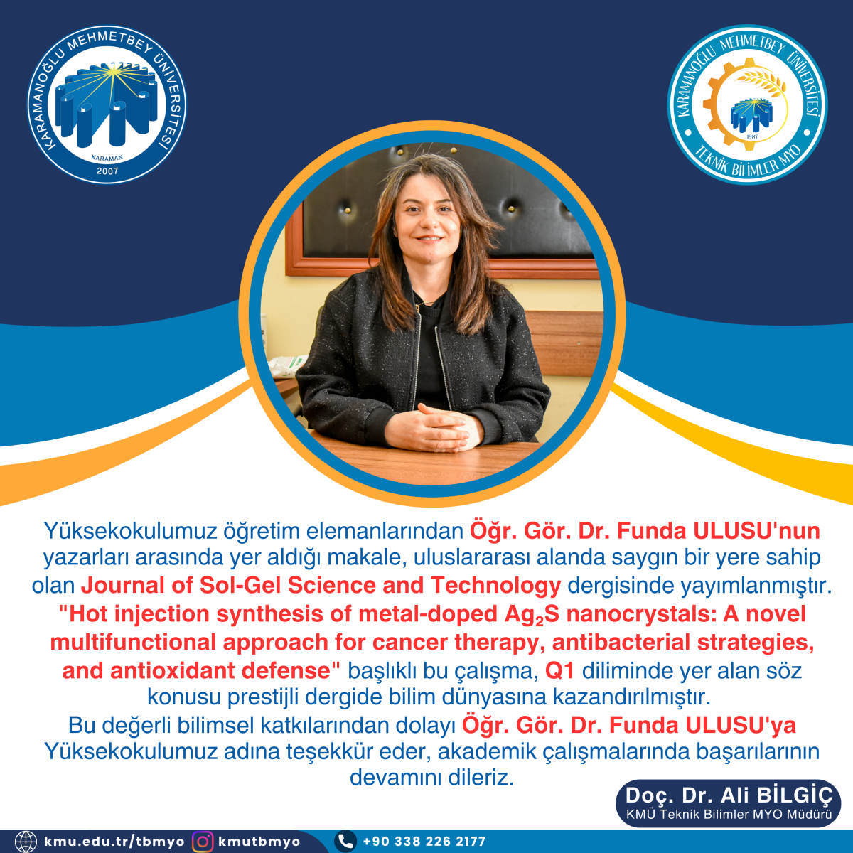 Yüksekokulumuz öğretim elemanlarından Öğr. Gör. Dr. Funda ULUSU'nun yazarları arasında yer aldığı makale, uluslararası alanda saygın bir yere sahip olan Journal of Sol-Gel Science and Technology dergisinde yayımlanmıştır. "Hot injection synthesis of metal-doped Ag₂S nanocrystals: A novel multifunctional approach for cancer therapy, antibacterial strategies, and antioxidant defense" başlıklı bu çalışma, Q1 diliminde yer alan söz konusu prestijli dergide bilim dünyasına kazandırılmıştır.
