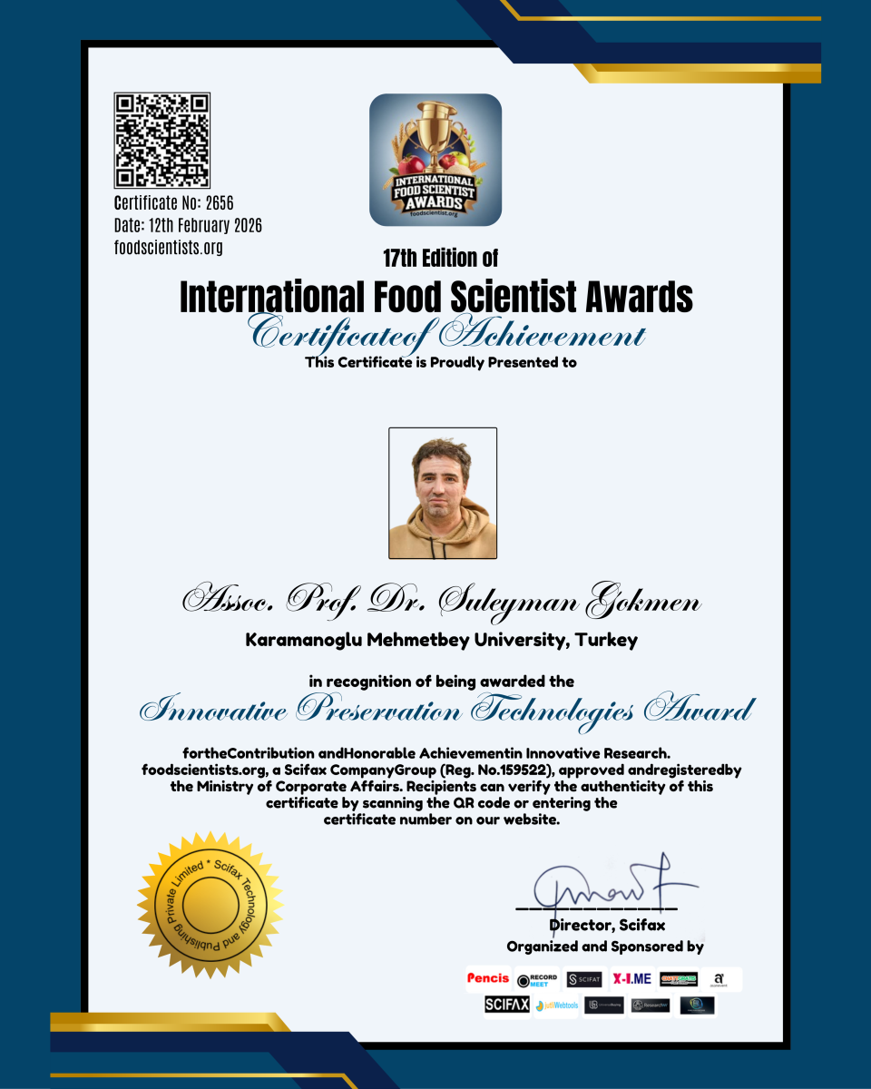 Yüksekokulumuz Öğretim Üyesi Doç. Dr. Süleyman GÖKMEN, gıda bilimi alanındaki yenilikçi çalışmalarıyla uluslararası düzeyde önemli bir başarıya daha imza atarak, Scifax Company Group tarafından yürütülen International Food Scientist Awards organizasyonunun 17'nci edisyonu kapsamında Innovative Preservation Technologies Award (Yenilikçi Gıda Koruma Teknolojileri Ödülü) ile ödüllendirilmiştir. 12 Şubat 2026 tarihinde verilen bu ödül, özellikle gıdaların raf ömrünün uzatılması ve modern koruma teknolojileri üzerine gerçekleştirdiği yenilikçi bilimsel katkılar değerlendirilerek takdim edilmiştir.